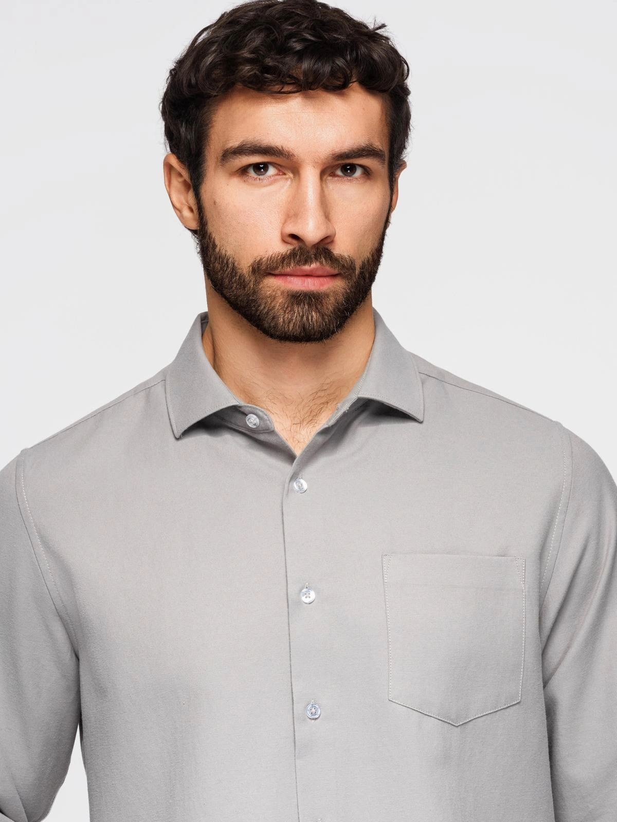 Men's regular fit shirt. Full button closure and classic collar. Chest pocket for easy storage of small items. Long sleeves with a safety button and a buttoned cuff allow for convenient wrist circumference adjustment. Rounded hem makes it easy to wear the shirt tucked into pants and outdoors. Cotton combined with polyester reduces creasing and simplifies care.