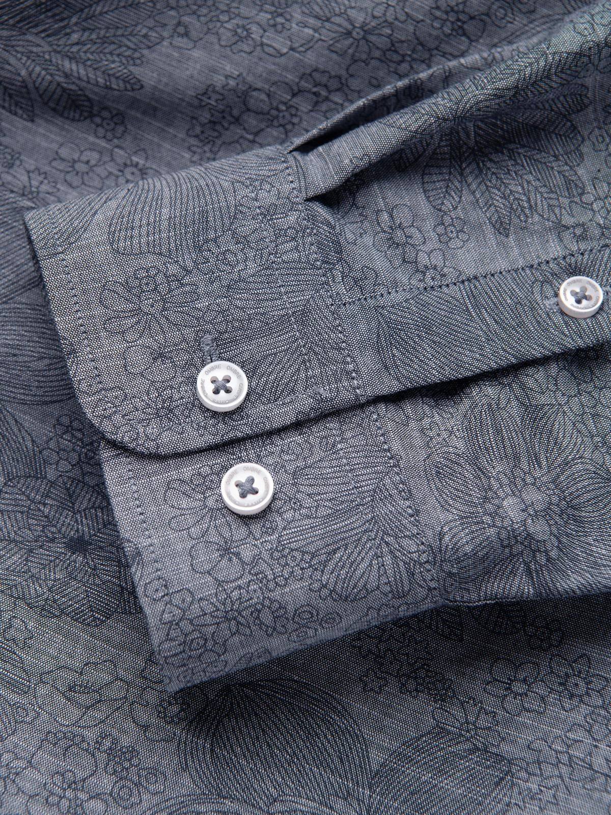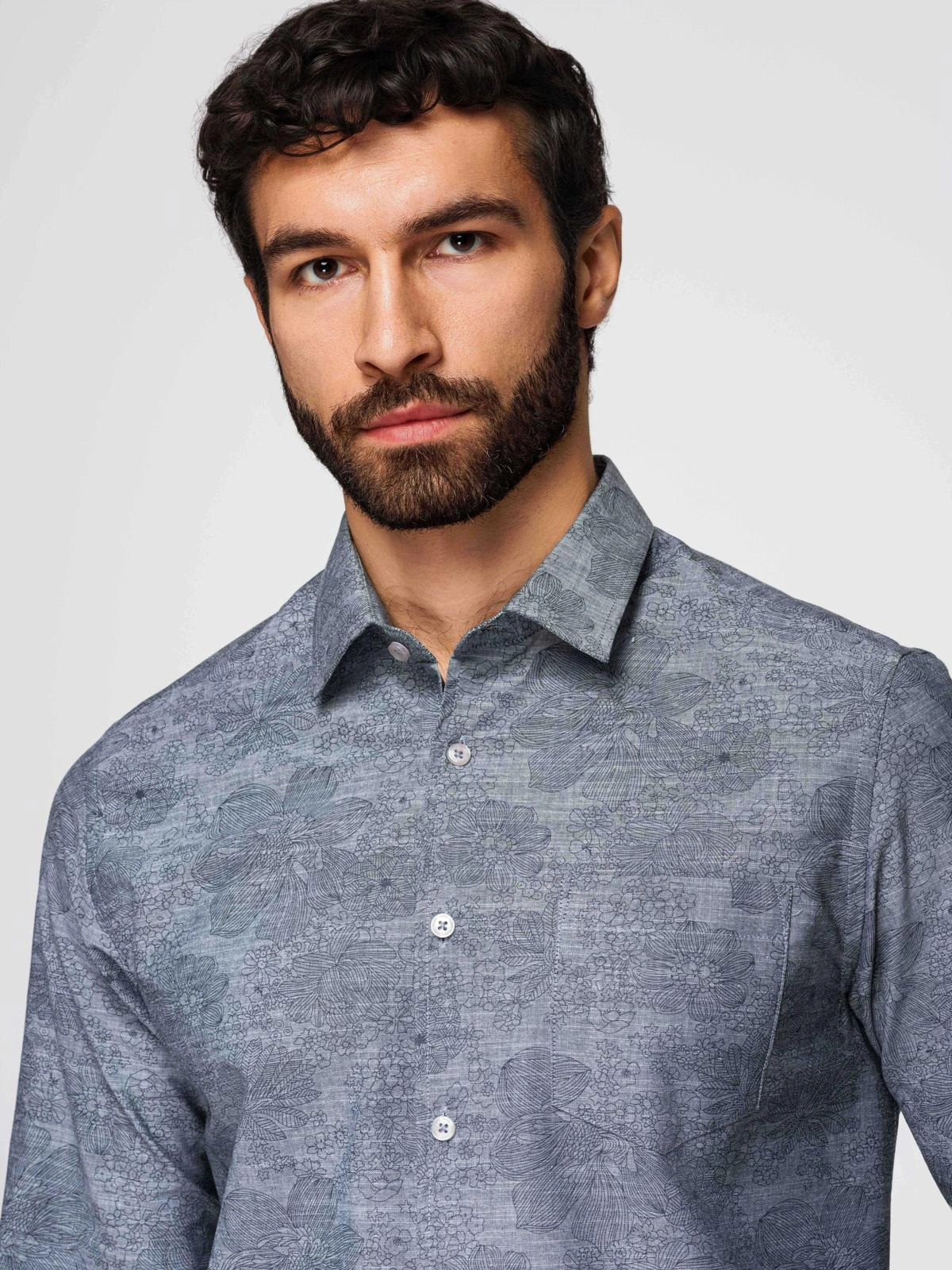 Men's regular cut shirt with a classic collar and full button closure. Made of soft cotton flannel, providing thermal comfort and a pleasant touch. Long sleeves finished with button cuffs, additional button at the sleeve opening. On the chest pocket. Semi-circular hem makes it easier to arrange the shirt. Back yoke with a counterfold for a freer range of motion. Fabric with muted floral print.