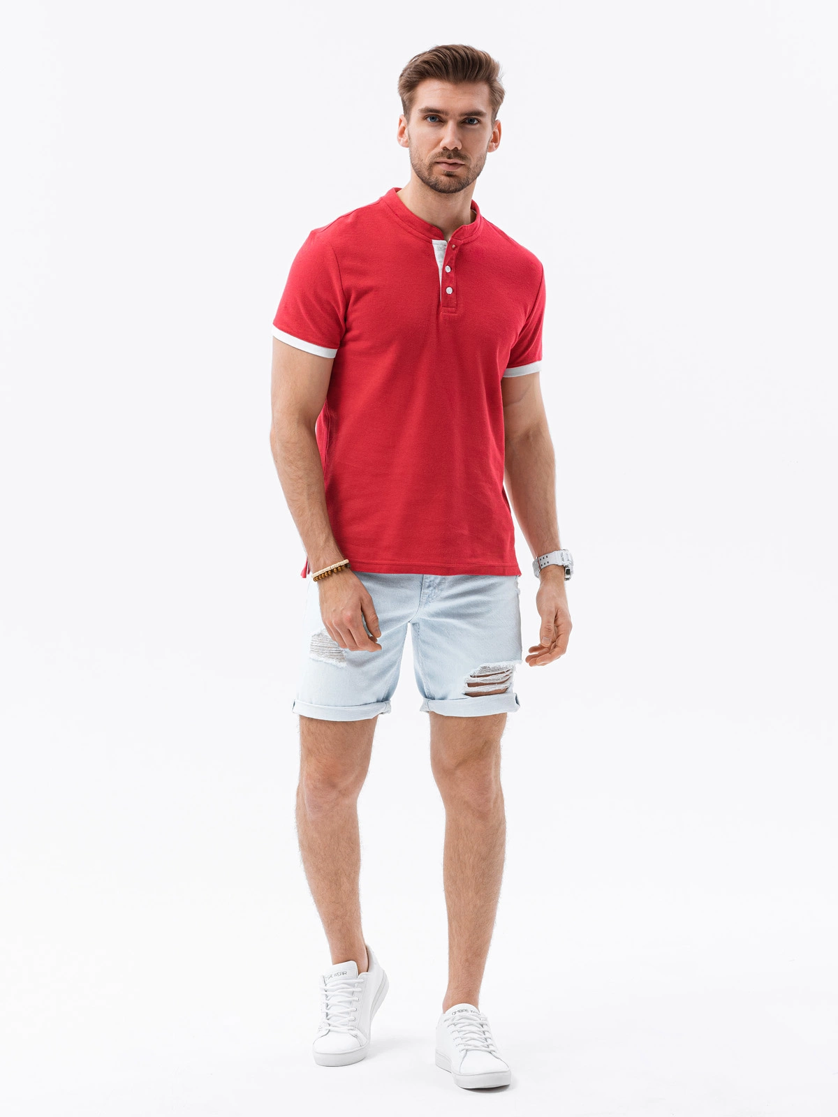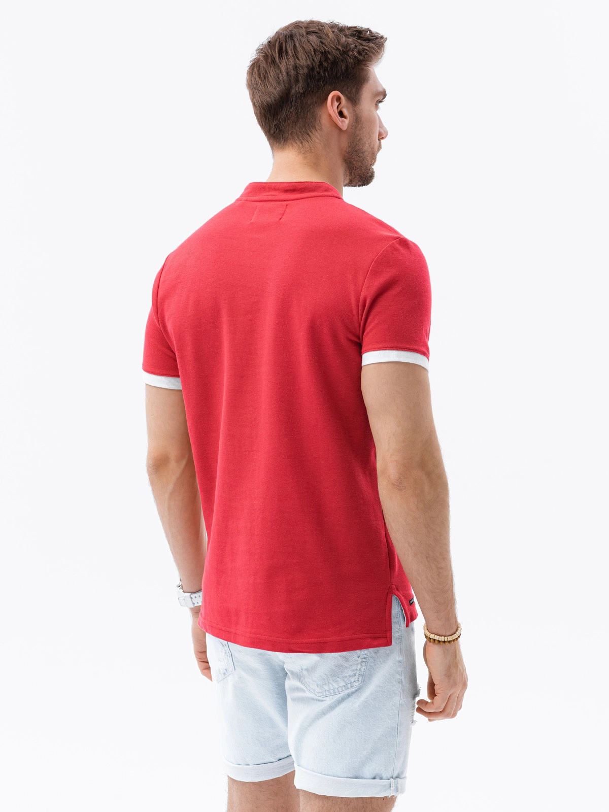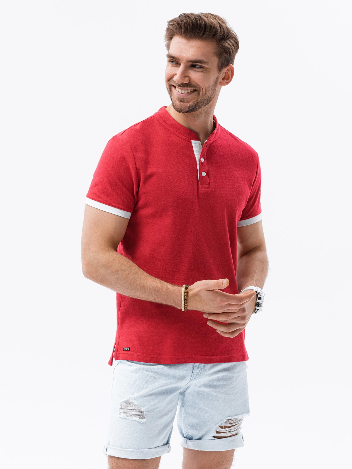 Men's polo shirt finished in a non-standard way, instead of a collar it has a stand-up collar, which gives an original look. The sleeves of the shirt are finished with a contrasting fabric. The shirt has cuts on the sides, so it fits perfectly on the body. The slightly fitted cut emphasizes the male silhouette.