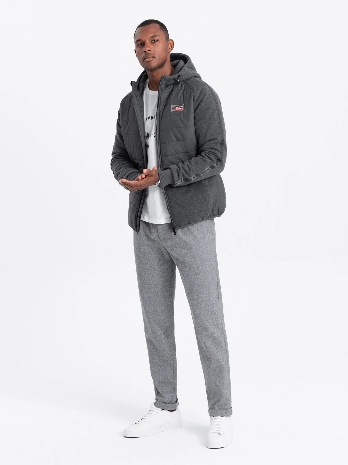 Ta stylowa kurtka z elementami dresowej dzianiny łączy funkcjonalność stylu outdoorowego z wygodą stylu athleisure. Zestawienie ze sobą gładkiej pikowanej tkaniny z miękką strukturalną dzianiną nadaje jej interesujący wygląd. Charakterystyczne naszywane kieszenie oraz lamówka z logotypem subtelnie podkreślają sportowy charakter kurtki. Dzięki wszechstronnemu zastosowaniu, z pewnością znajdzie swoje miejsce w męskiej szafie lub bagażu.