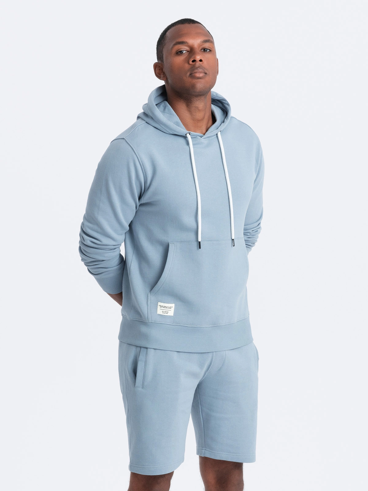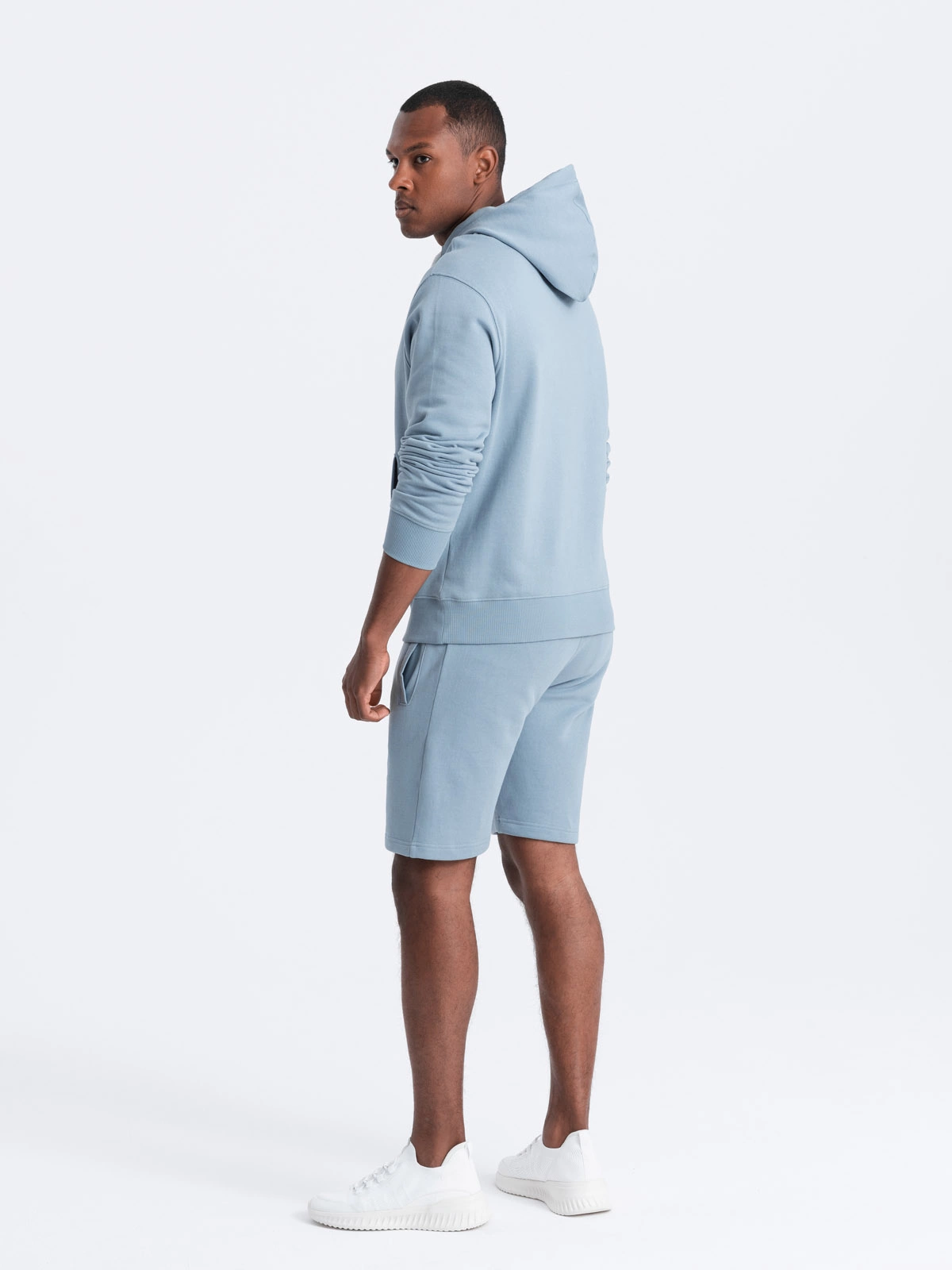 Krótkie spodenki dresowe w zestawie z bluzą kangurką to outfit idealny na czas wypoczynku. Bawełniana dzianina z efektem peach od wewnątrz sprawia, że komplet jest przyjemny w noszeniu. Stylu i funkcjonalności dodają praktyczne kieszenie. Szorty i bluza w komplecie tworzą swobodny casualowy zestaw – można je również wystylizować oddzielnie, traktując jako bazę do letnich outfitów.