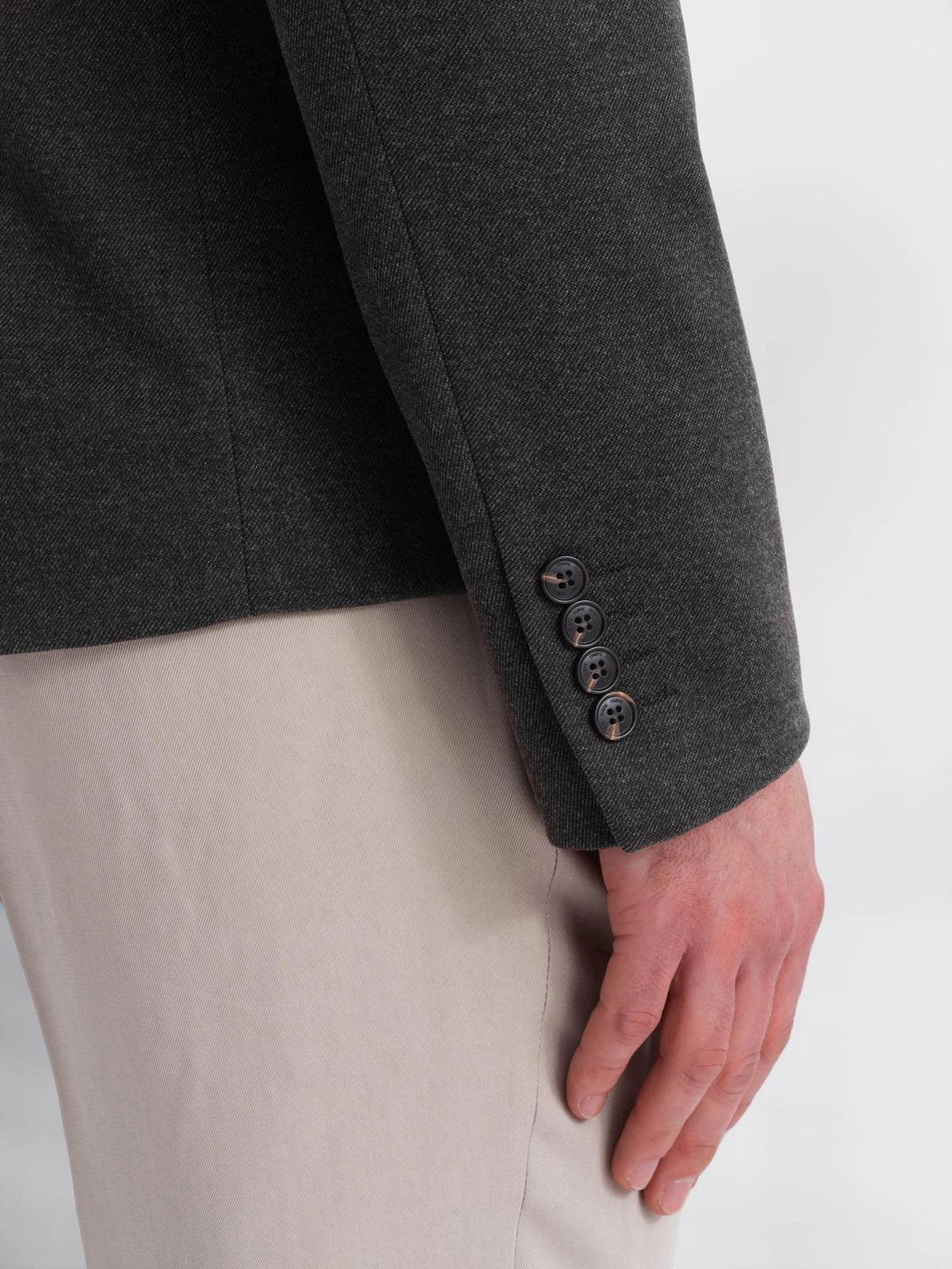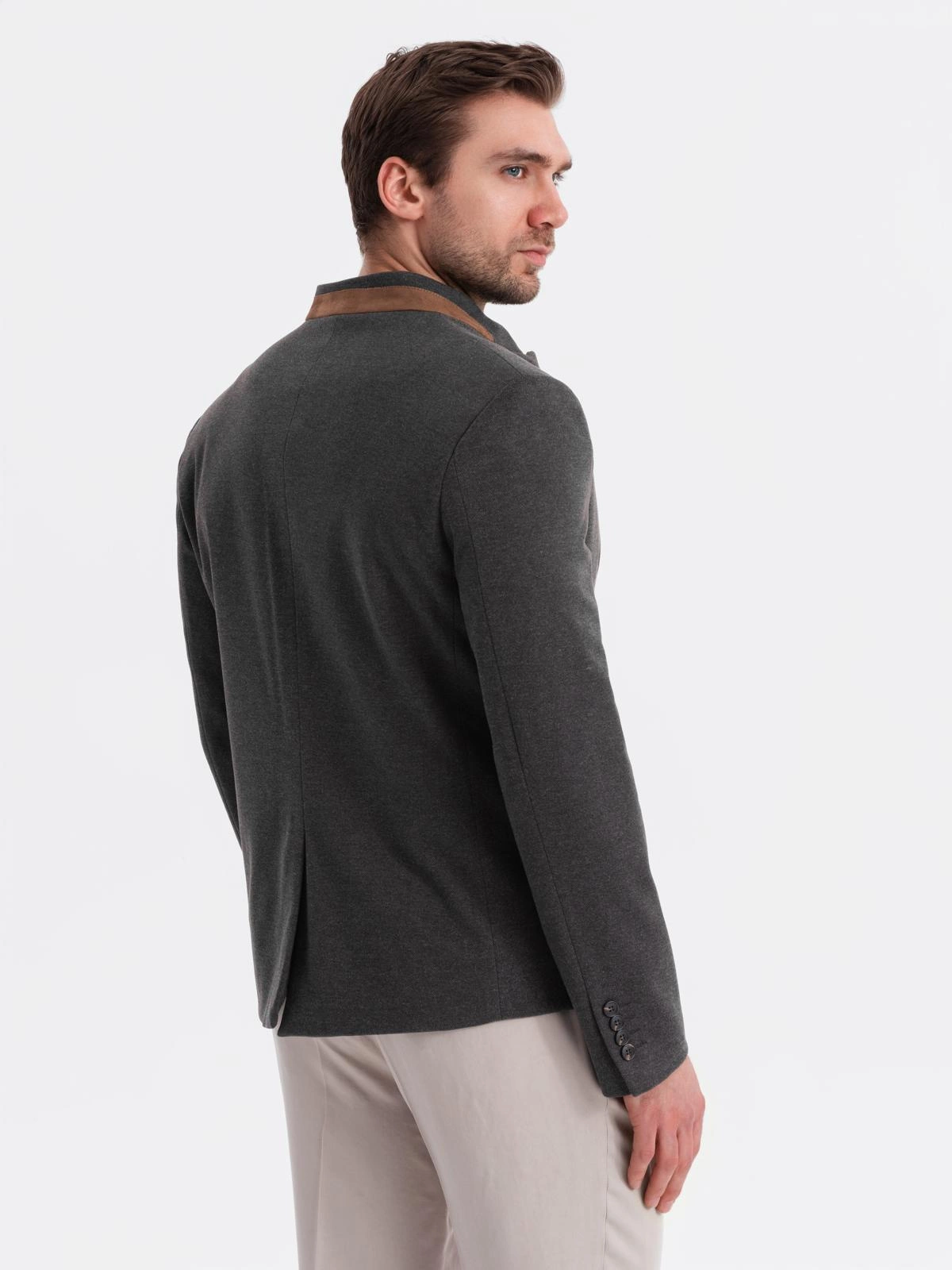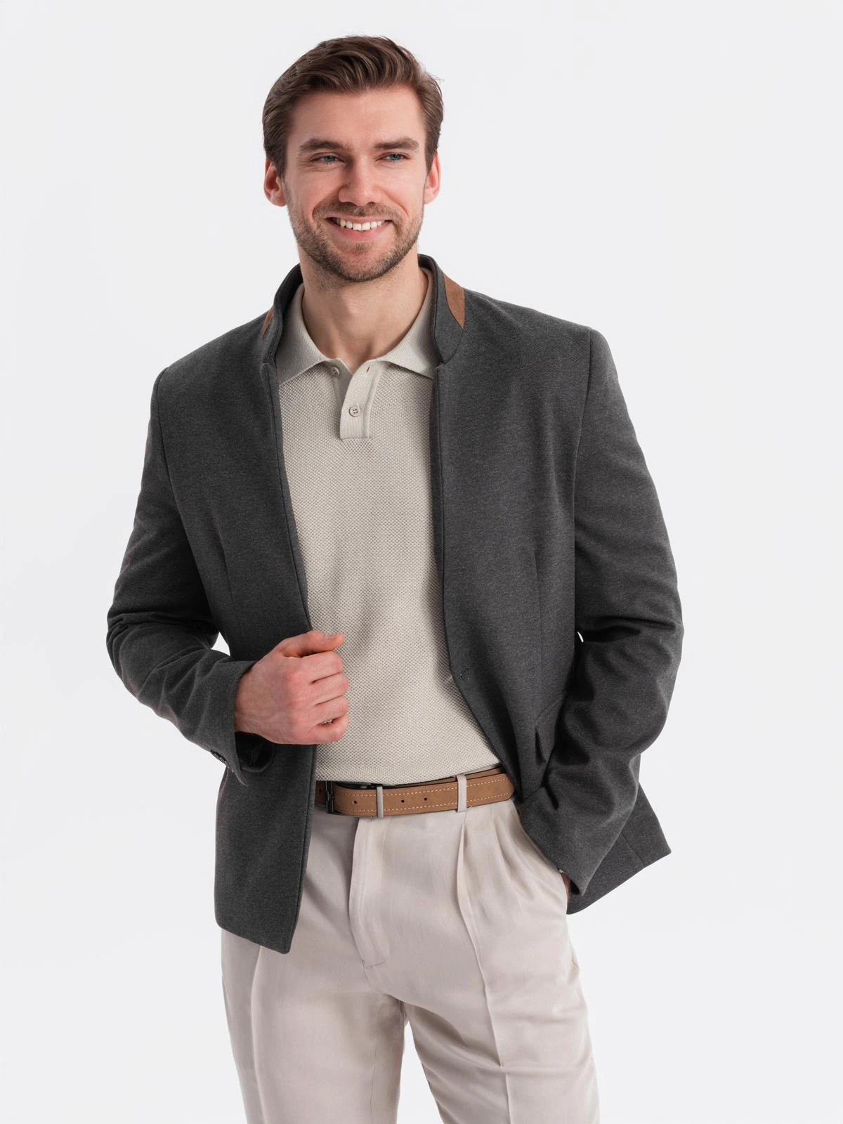 Ten model z kolekcji Ombre Quintessence definiuje na nowo klasyczną męską marynarkę. Jej nietypowy krój sprawdzi się zarówno w konwencji smart casual, jak i w bardziej formalnym wydaniu. Klasyczny kołnierz jest tu zastąpiony stójką z miękkim wykończeniem z eko skóry. Marynarka zachwyca delikatną strukturą materiałów, a szlachetności nadaje jej melanżowa tkanina z dodatkiem rayonu.