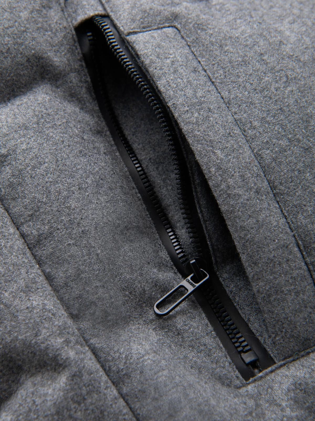 - strukturalna tkanina z widocznymi włóknami wełny oraz wewnętrzną wiatroszczelną powłoką