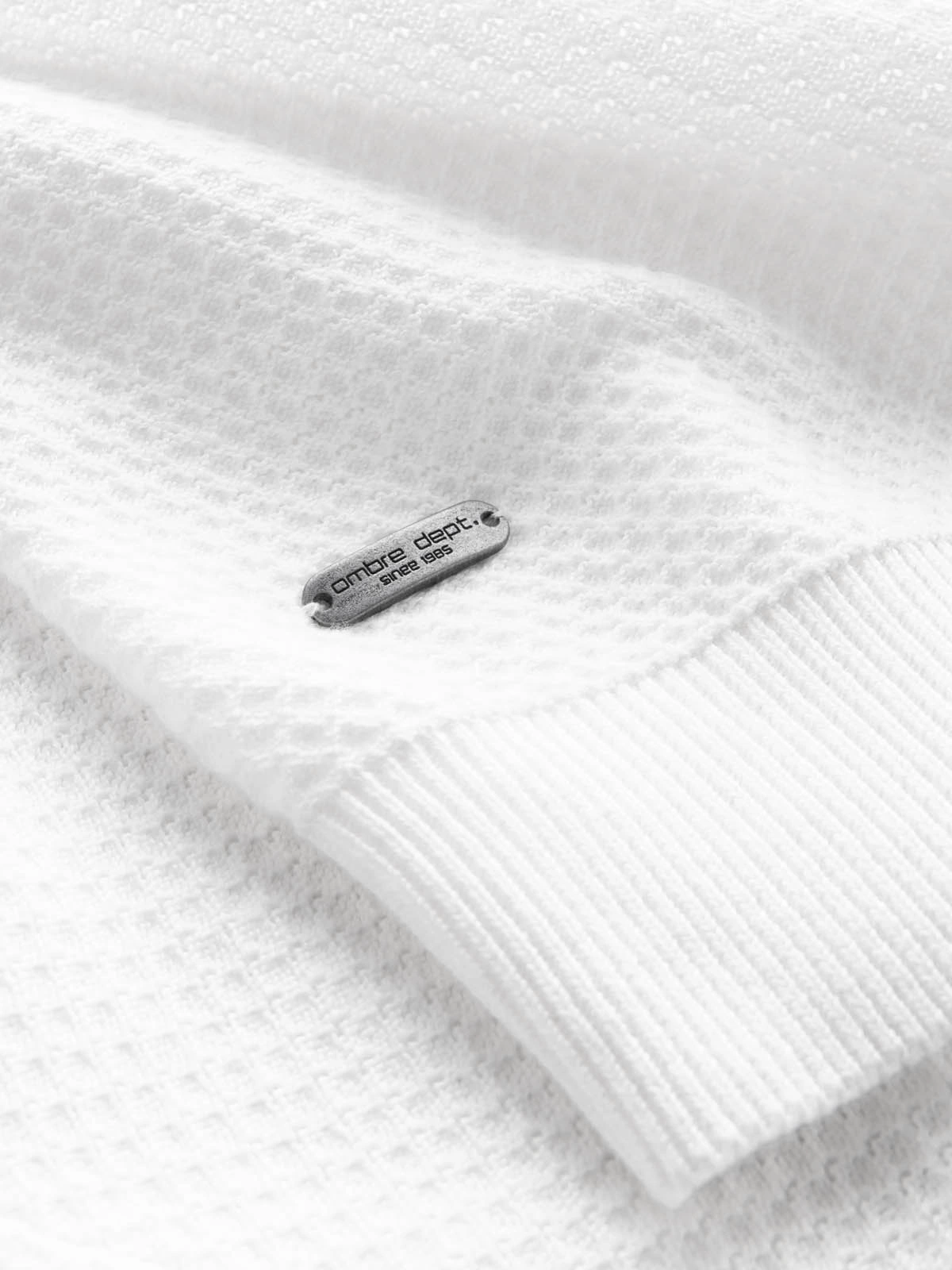 Ten męski sweter w stylu casual ceniony jest za swój uniwersalny charakter. Idealnie pasuje do wielu klasycznych elementów męskiej garderoby – ma delikatnie rozluźniony krój, dzięki czemu jest komfortowy w noszeniu. Miła w dotyku bawełniana dzianina o charakterystycznym splocie sprawia, że zyskuje przyjazną sensorycznie fakturę. Diamentowy wzór subtelnie zdobi sweter, nadając codziennym stylizacjom niepowtarzalny wygląd.