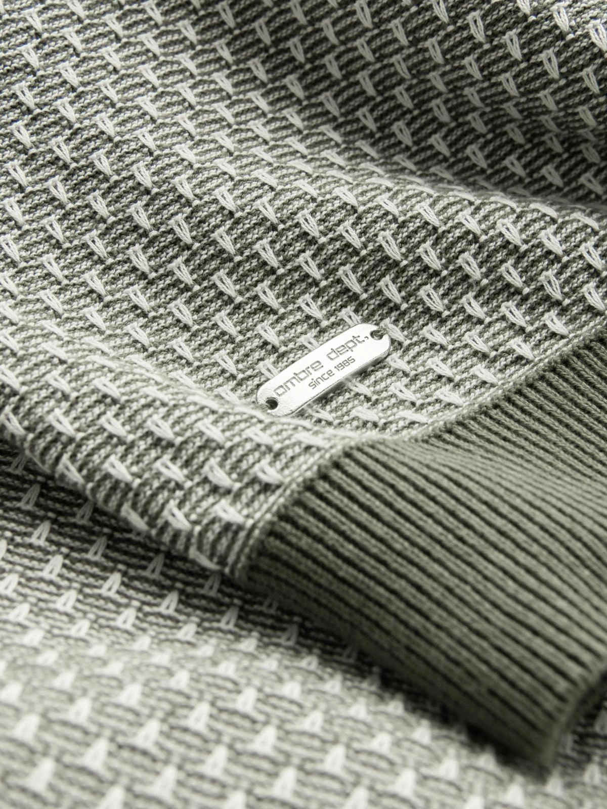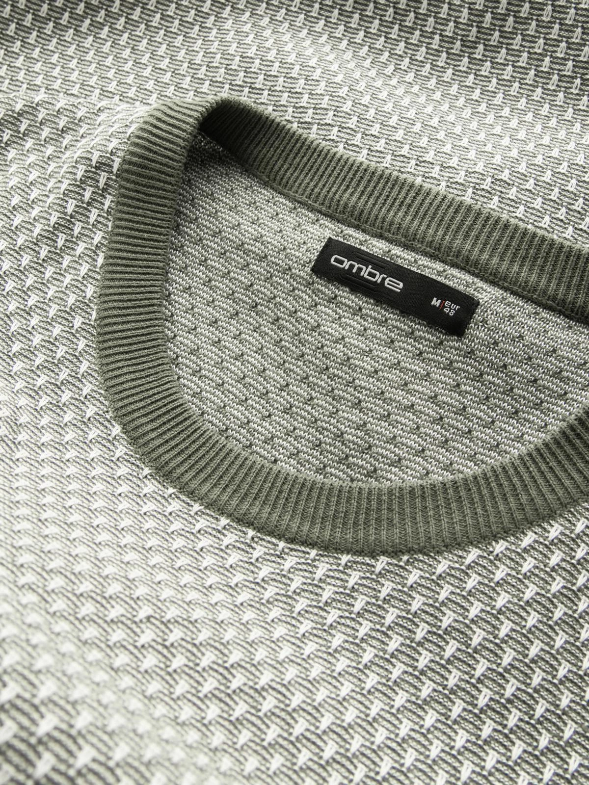 Bawełniany męski sweter o delikatnie rozluźnionym kroju dopasuje się do swobodnych zestawów. To idealny wybór dla mężczyzn łączących wygodę ze stylem na co dzień. Dzianina o charakterystycznym ozdobnym splocie z dwukolorowych nici skutecznie przykuwa uwagę, tworząc intrygujący efekt wizualny. Dekolt, mankiety oraz dół swetra, wykończone ściągaczem w ciemniejszych barwach, kontrastują z jasnym motywem przewodnim, nadając całości unikalny design.