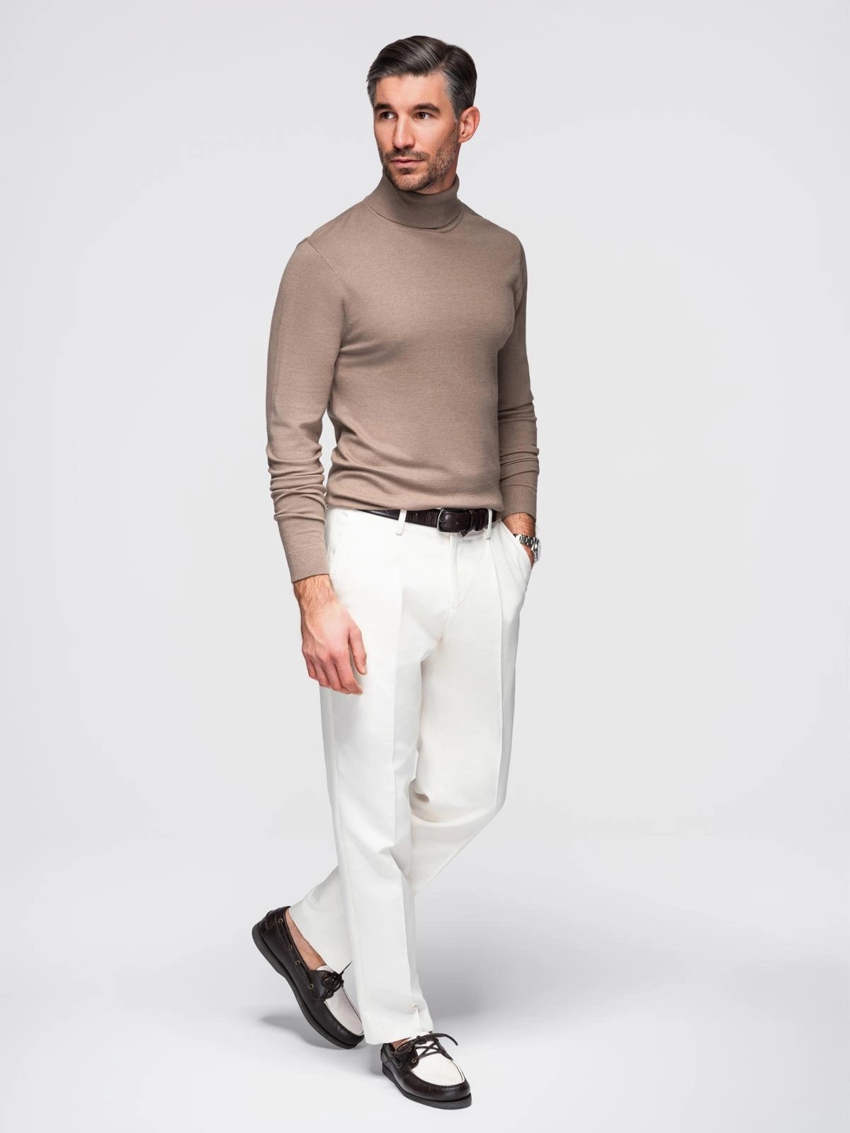 Ten sweter z golfem jest wręcz stworzony do zestawów w eleganckim klimacie. Szlachetności dodaje mu gładka melanżowa dzianina z wiskozą w składzie. Przyjemny w dotyku materiał układa się na ciele jak druga skóra, zapewniając komfort oraz swobodę ruchów. Sweter można potraktować zarówno jako praktyczną warstwę odzieży, jak i wyrazisty element nadający ton całej stylizacji.