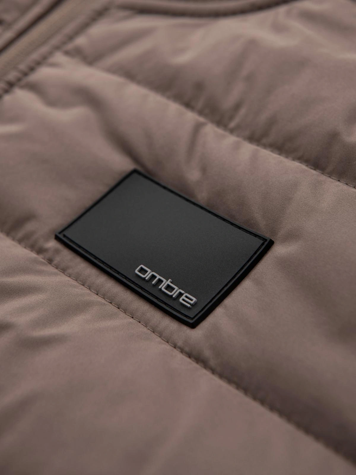 Lekka męska kurtka z łączonych materiałów z kapturem i ozdobnym pikowaniem – jasnobrązowa V2 OM-JANP-0160