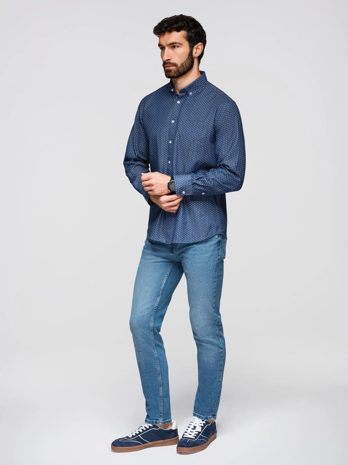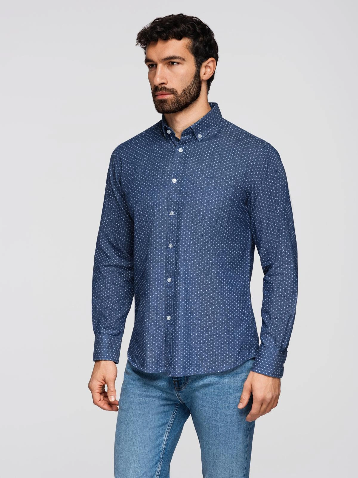 Koszula we wzorki z cienkiego jeansu to nietuzinkowa propozycja z kolekcji Ombre Denim. Lekka i gładka tkanina oraz prosty fason podkreśla jej casualowy charakter. Guziki na mankietach i kołnierzyku zapewniają szerokie możliwości stylizacji. W połączeniu ze swetrem lub luźną marynarką pozwoli uzyskać ciekawy look w stylu smart casual.