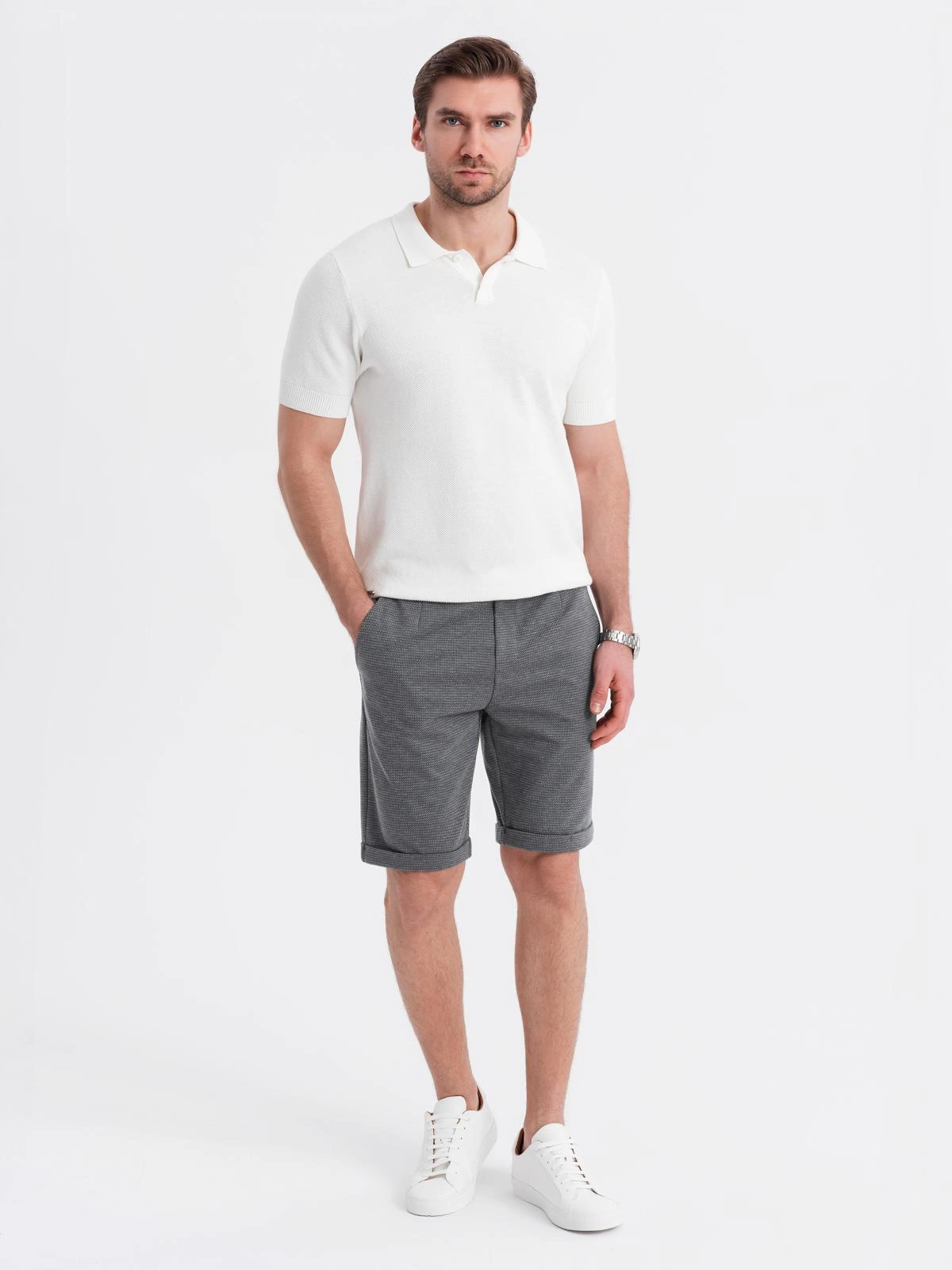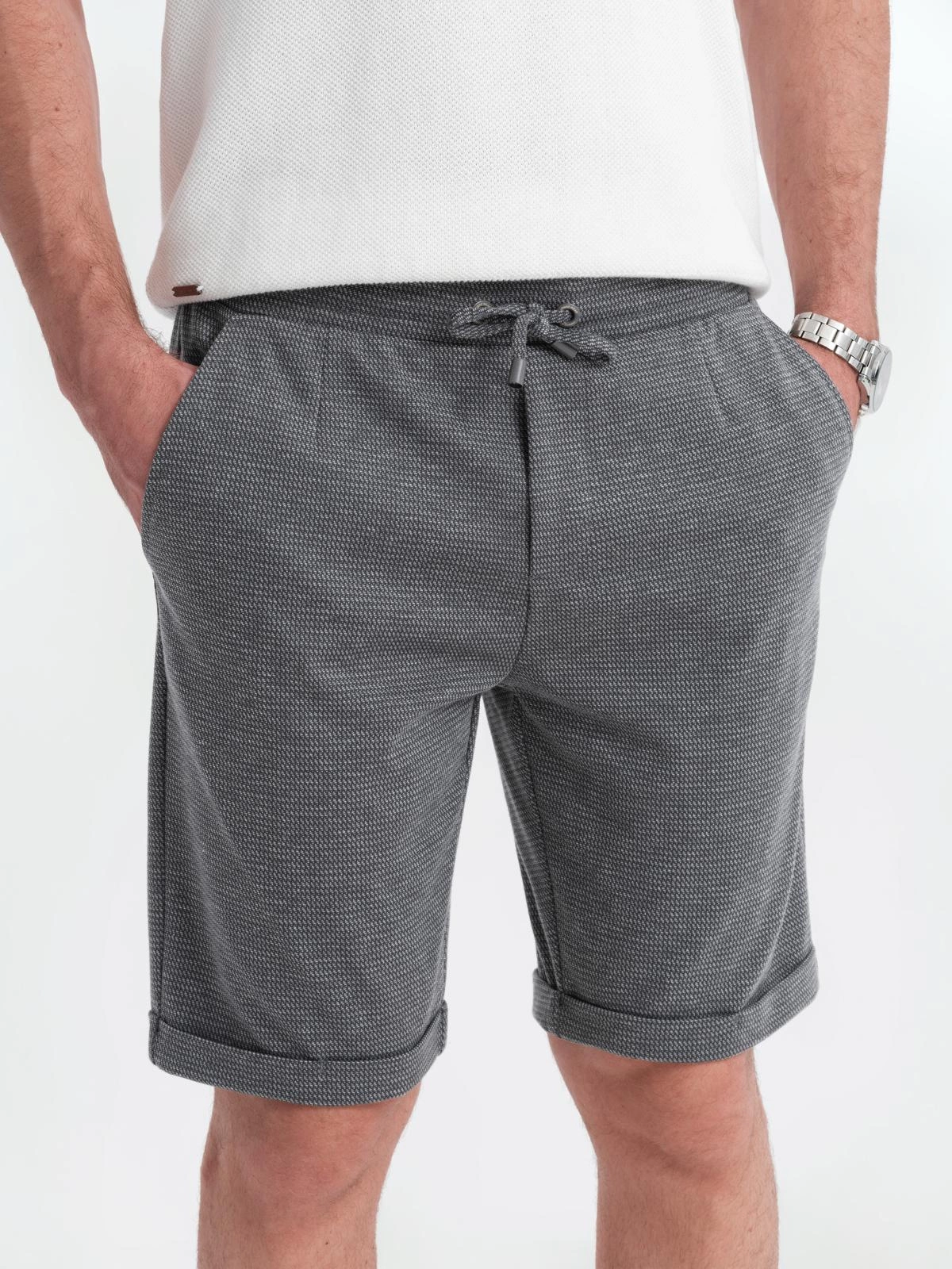 Dzianinowe spodenki z podwiniętymi nogawkami są stworzone do oryginalnych i nieoczywistych stylizacji. Wprowadzają odrobinę nonszalancji do klasycznych zestawów w stylu smart casual. Szorty z powodzeniem łączą wygodę z elegancją – spodobają się mężczyznom lubiącym przełamywać modowe schematy. Ich intrygujący charakter podkreśla charakterystyczna strukturalna dzianina oraz podwinięte nogawki.