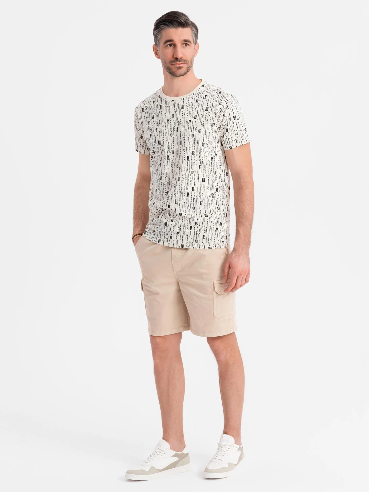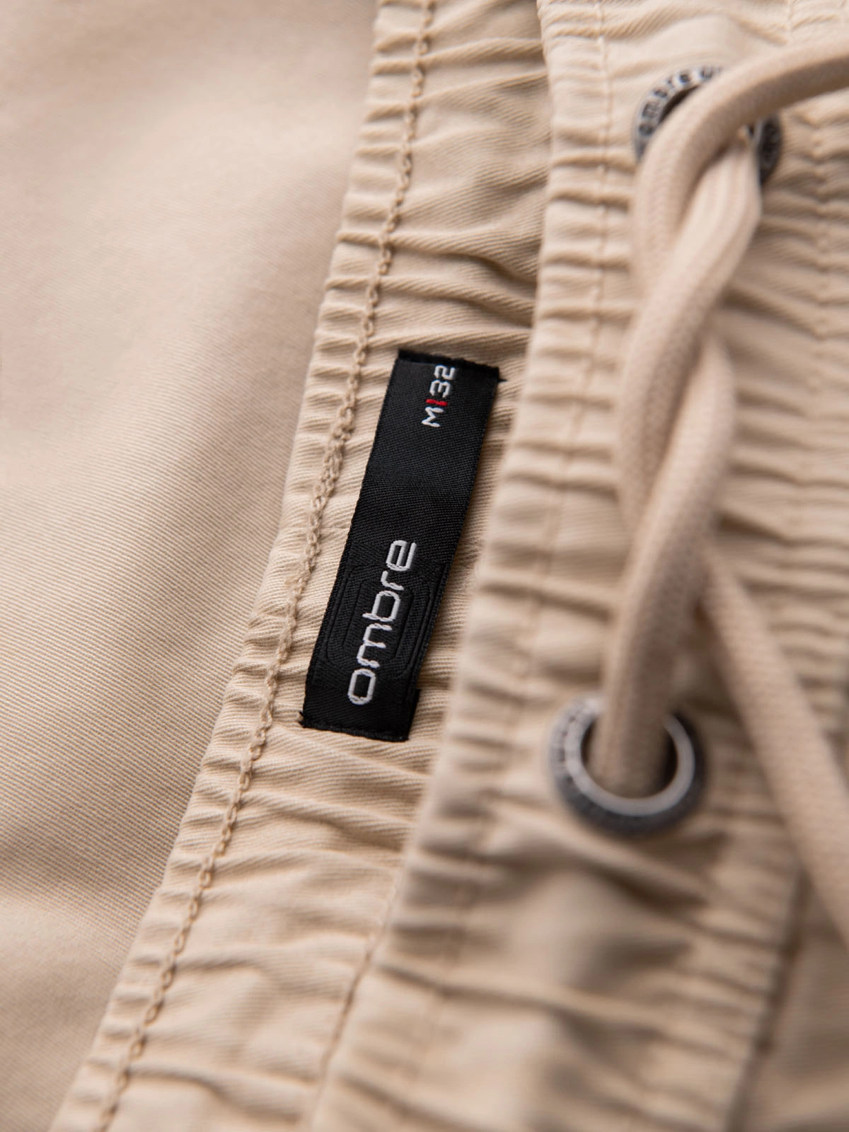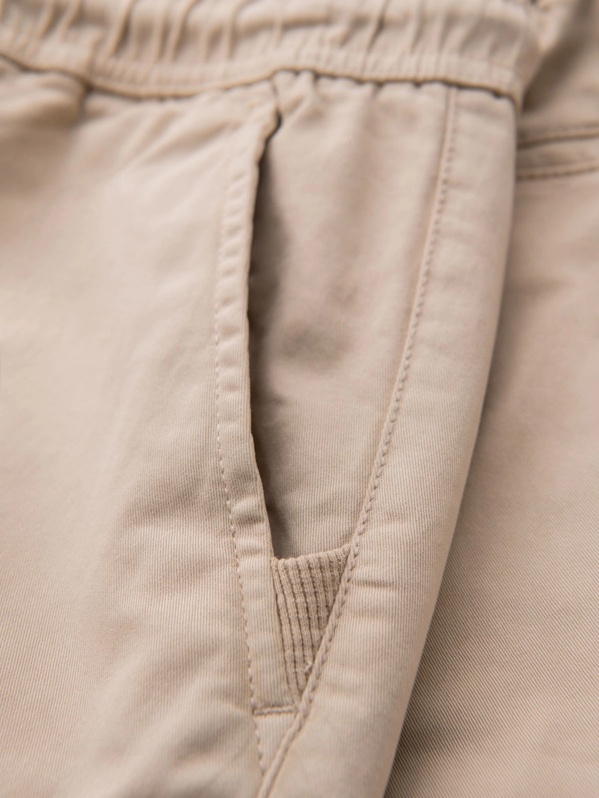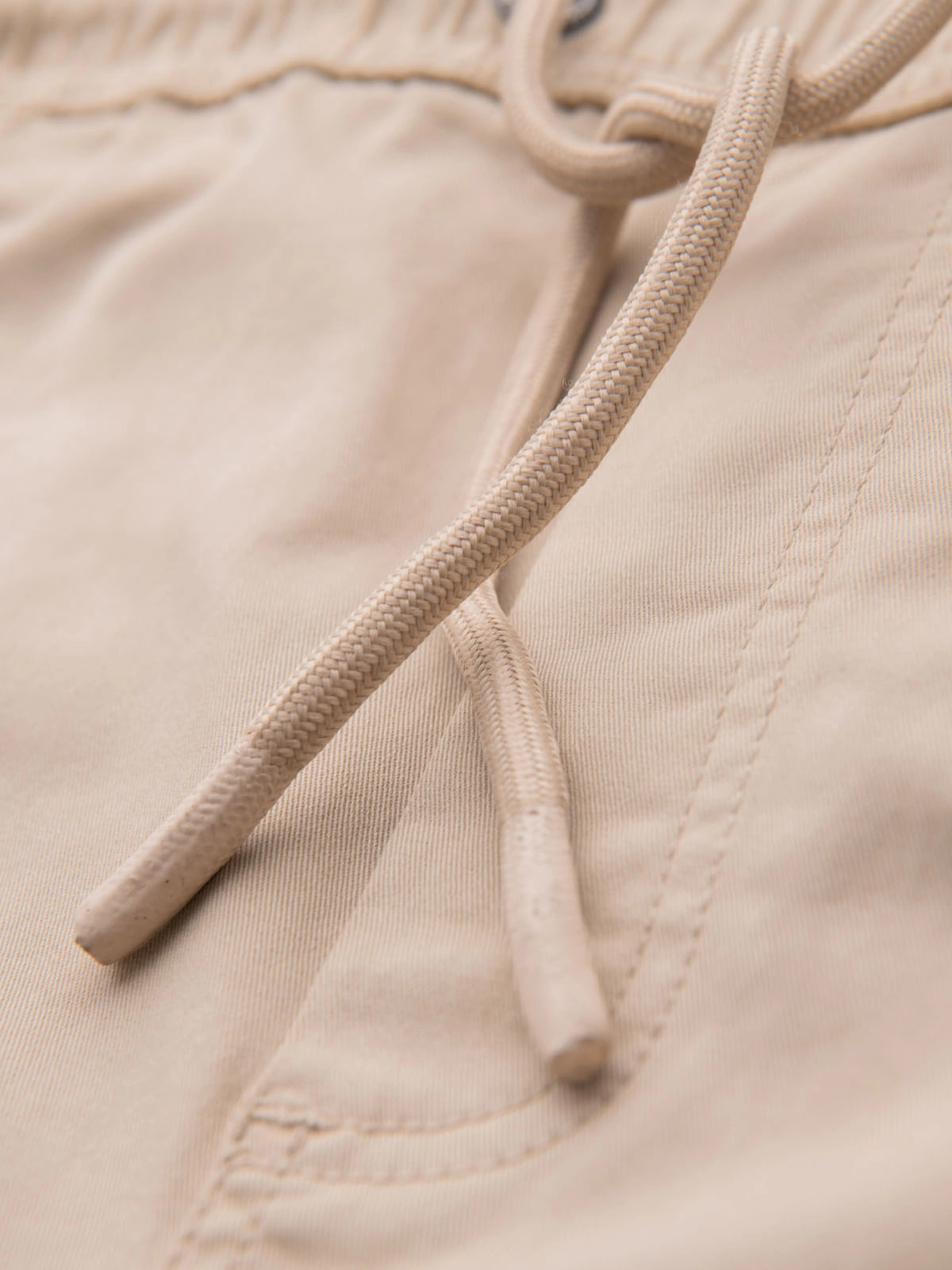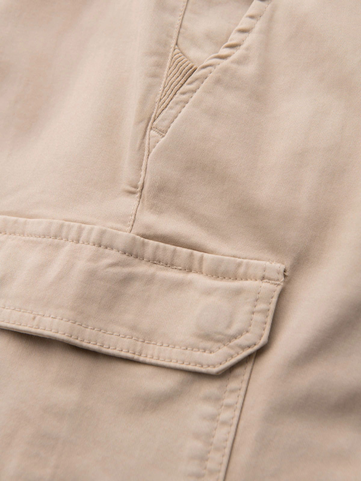 Szorty cargo w nowoczesnym wydaniu, wykonane z bawełnianej tkaniny z dodatkiem elastanu i wykończone procesem enzyme wash & softener dla zwiększonej miękkości i komfortu noszenia. Luźniejszy krój i szeroka nogawka zapewniają swobodę ruchów, a elastyczny pas ze sznurkiem umożliwia indywidualne dopasowanie. Praktyczne kieszenie cargo oraz funkcjonalne detale, takie jak dzianinowe wstawki, brandowana metka i gumowane końcówki sznurka, podkreślają użytkowy charakter spodenek. Idealny wybór na codzienne letnie stylizacje.