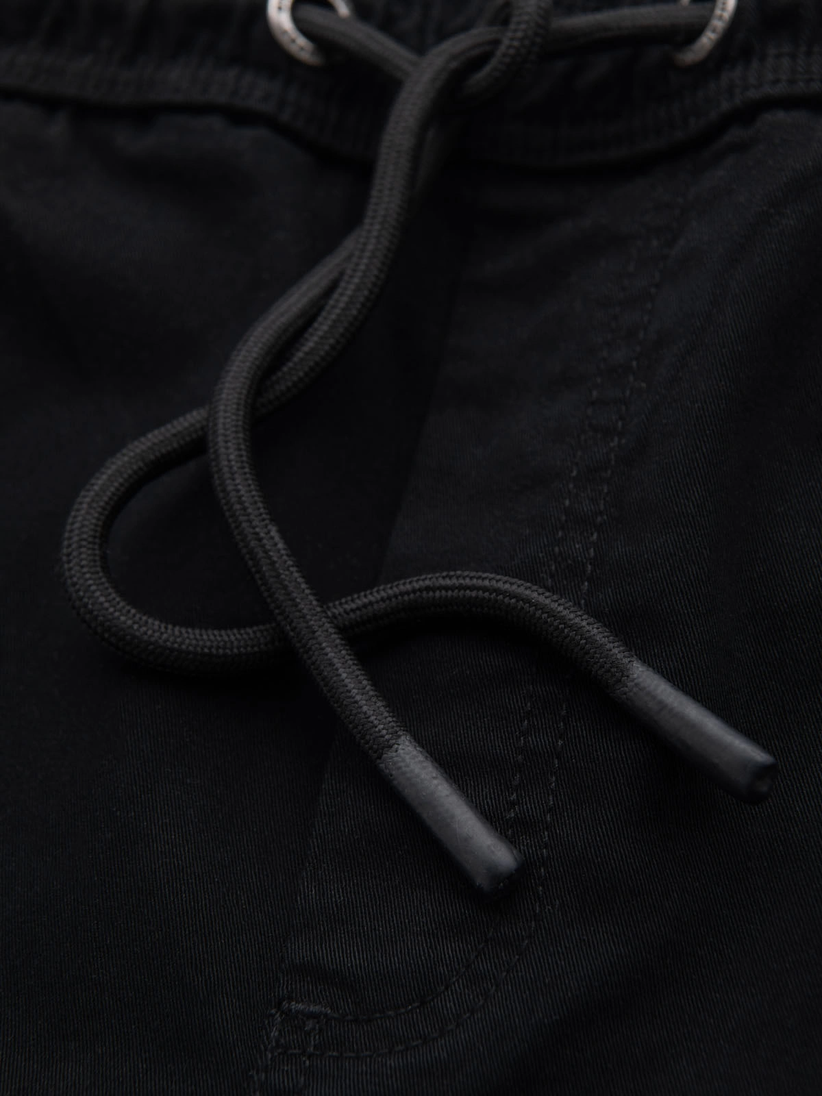 Szorty cargo w nowoczesnym wydaniu, wykonane z bawełnianej tkaniny z dodatkiem elastanu i wykończone procesem enzyme wash & softener dla zwiększonej miękkości i komfortu noszenia. Luźniejszy krój i szeroka nogawka zapewniają swobodę ruchów, a elastyczny pas ze sznurkiem umożliwia indywidualne dopasowanie. Praktyczne kieszenie cargo oraz funkcjonalne detale, takie jak dzianinowe wstawki, brandowana metka i gumowane końcówki sznurka, podkreślają użytkowy charakter spodenek. Idealny wybór na codzienne letnie stylizacje.