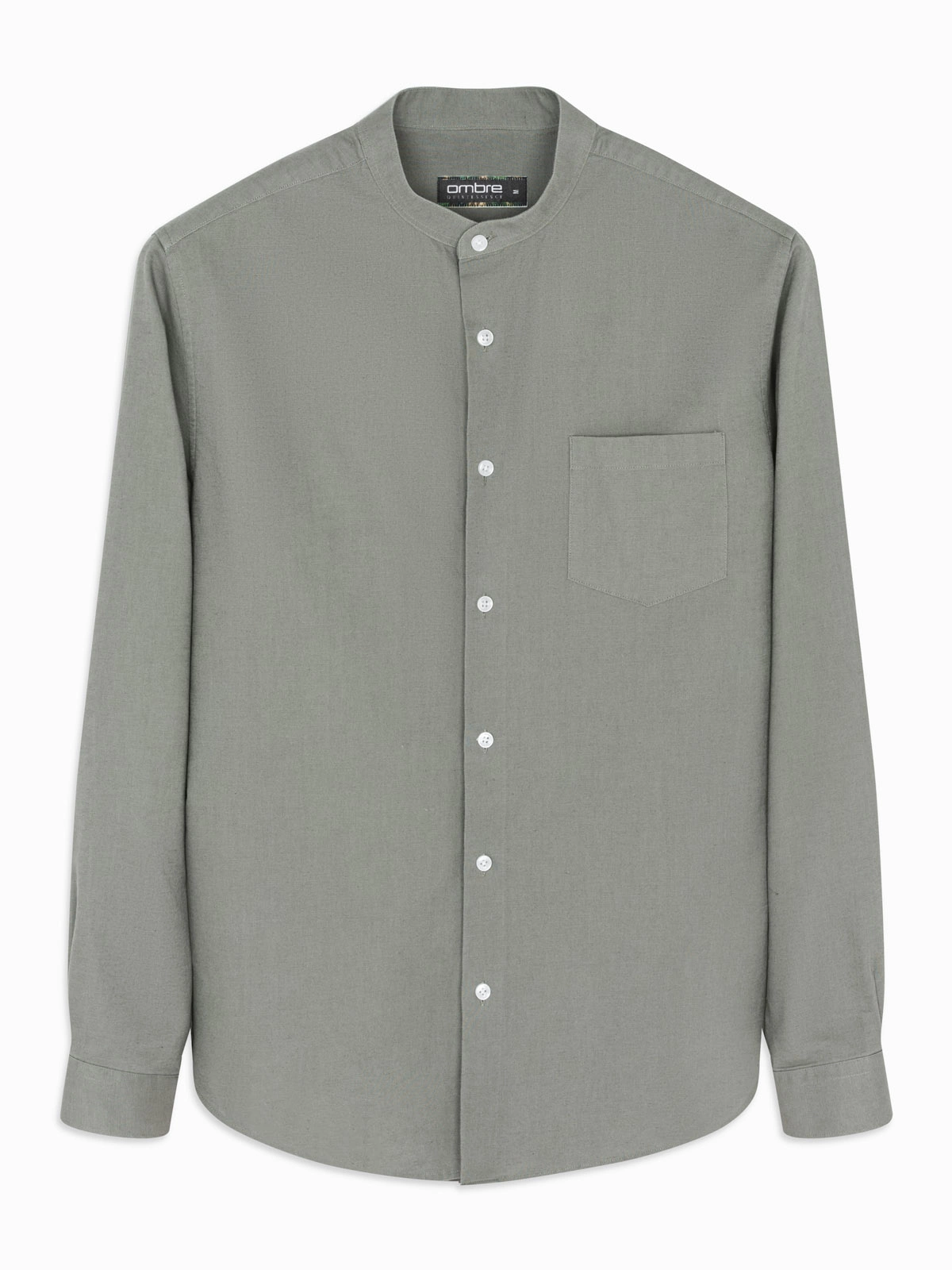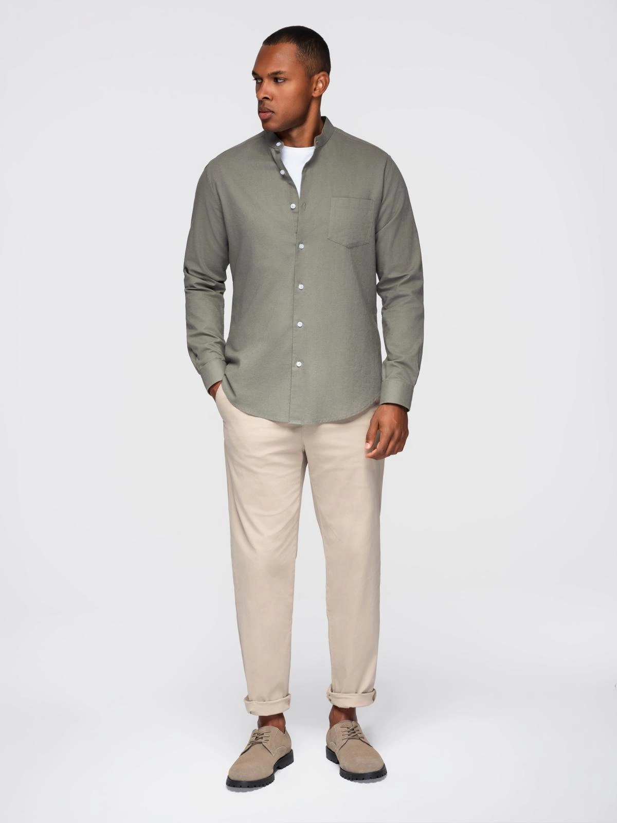 Koszula męska o casualowym charakterze idealna na wiosenno-letnie stylizacje w duchu luzu i klasy. Uszyta z naturalnej mieszanki bawełny i lnu, zapewniająca przewiewność i wygodę noszenia. Prosty fason z długim rękawem został wzbogacony o stójkę i zaokrąglony dół, co nadaje całości nowoczesnego i minimalistycznego wyglądu. Perłowe guziki z logo i kieszeń na piersi to subtelne detale, które podkreślają dopracowanie projektu.