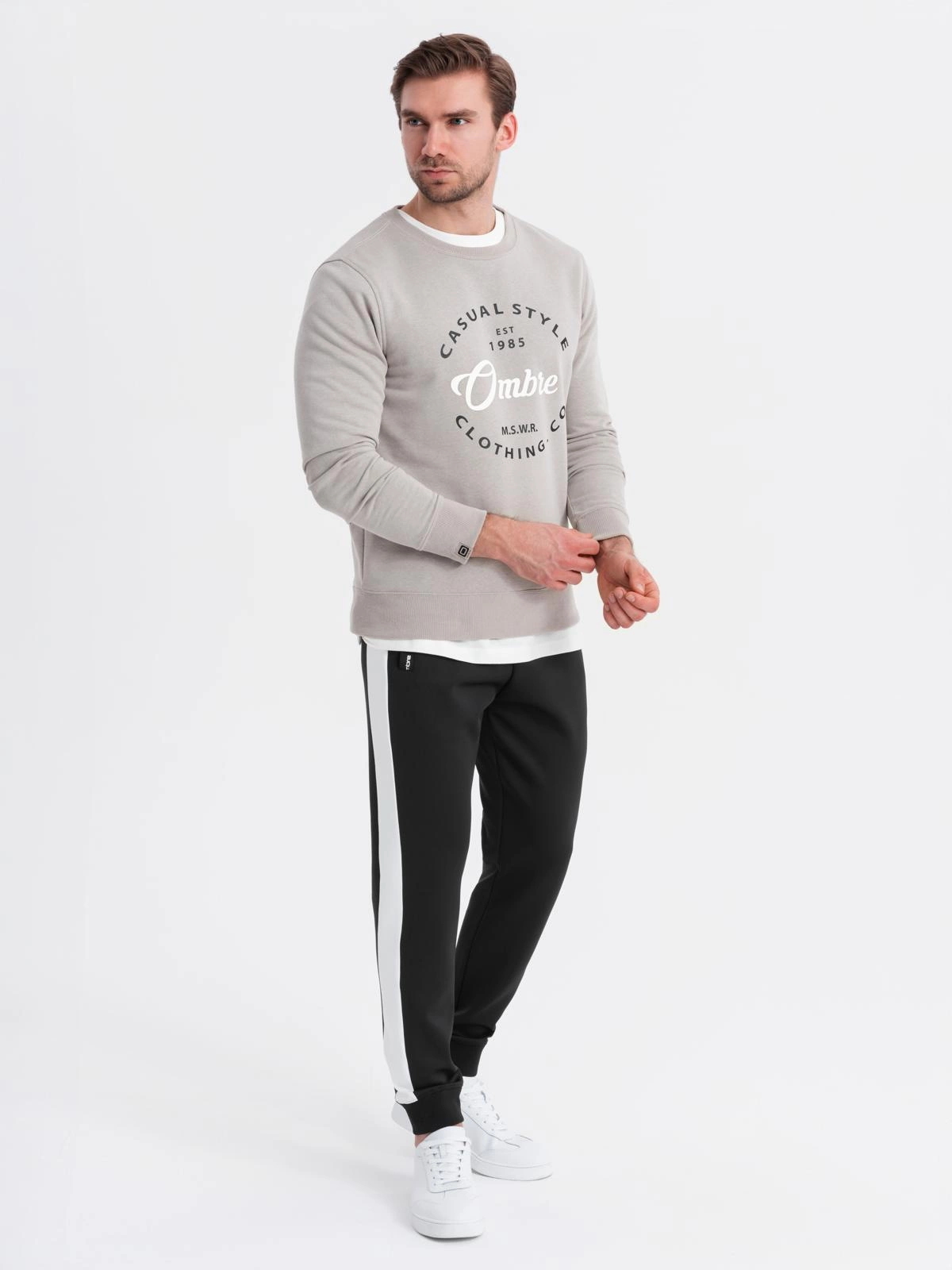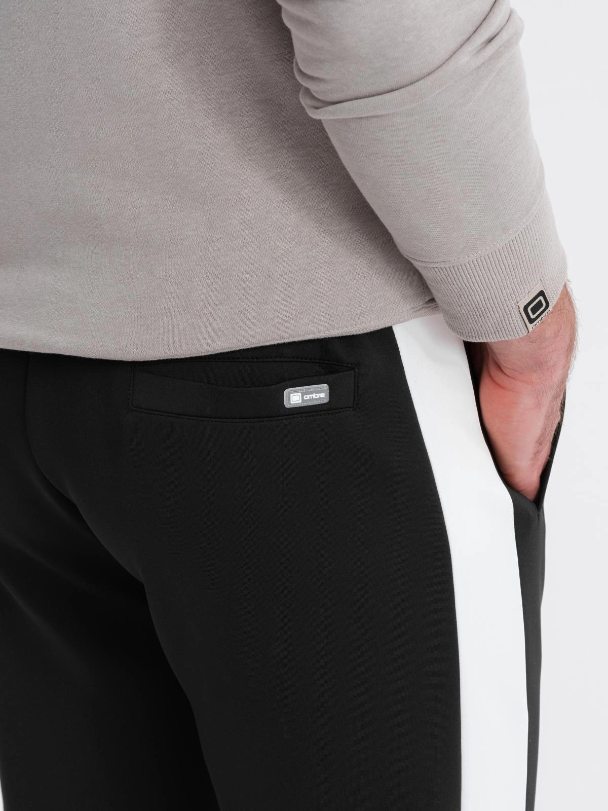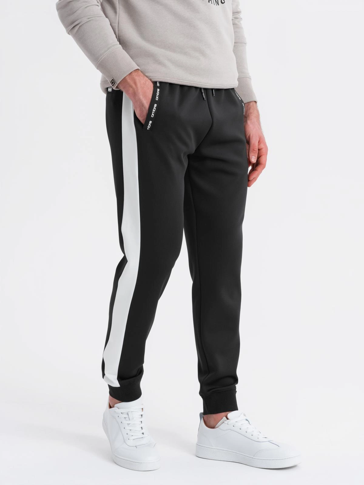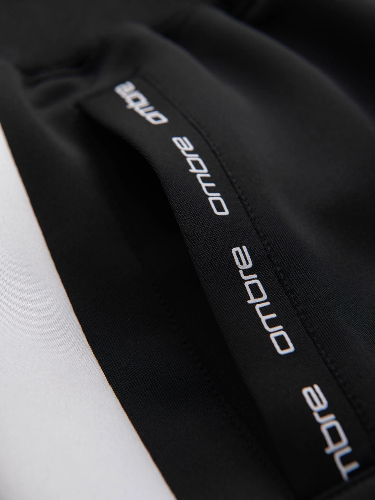 Spodnie dresowe w stylu jogger wykonane z elastycznej dzianiny o delikatnym połysku, zapewniającej wygodę i swobodę ruchów. Zwężana nogawka ze ściągaczem i kontrastowe lampasy nadają całości sportowego charakteru w stylu retro. Nowoczesny design dopełniają cięte kieszenie, gumowa naszywka przy pasie oraz logowane detale na kieszeniach i zakończeniach sznurków.