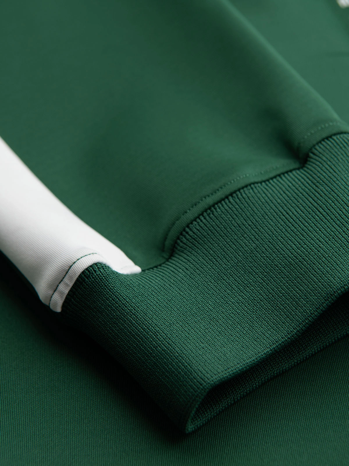 Spodnie dresowe w stylu jogger wykonane z elastycznej dzianiny o delikatnym połysku, zapewniającej wygodę i swobodę ruchów. Zwężana nogawka ze ściągaczem i kontrastowe lampasy nadają całości sportowego charakteru w stylu retro. Nowoczesny design dopełniają cięte kieszenie, gumowa naszywka przy pasie oraz logowane detale na kieszeniach i zakończeniach sznurków.