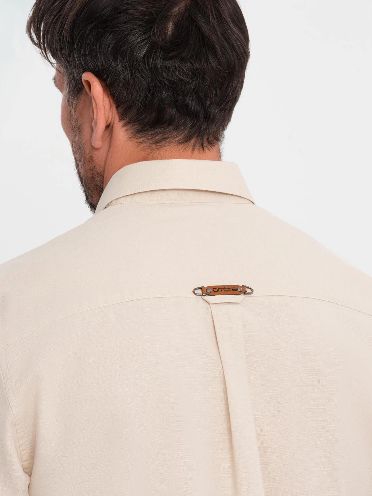 Koszula męska o regularnym kroju wykonana z przewiewnej tkaniny bawełniano-lnianej, zaprojektowana z myślą o codziennym komforcie i ponadczasowej elegancji. Klasyczny kołnierzyk i zaokrąglony dół podkreślają formalny, ale uniwersalny charakter modelu. Subtelne detale, takie jak guziki z logo, podwójne kieszenie na piersi oraz dekoracyjna naszywka ze sztucznej skóry na plecach, tworzą spójny, dopracowany wizerunek idealny na sezon wiosna–lato.