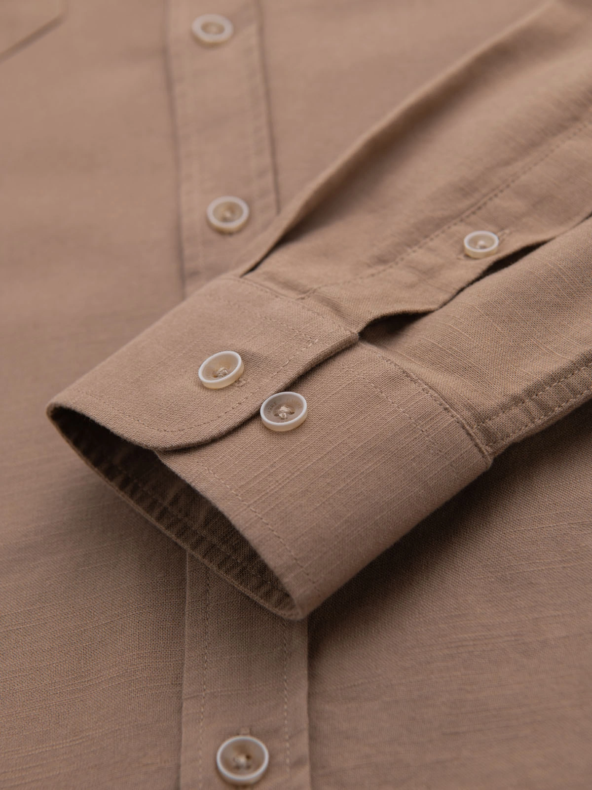 Koszula męska lniana z klasycznym kołnierzykiem i kieszeniami REGULAR FIT – jasnobrązowa V7 OM-SHCS-0134