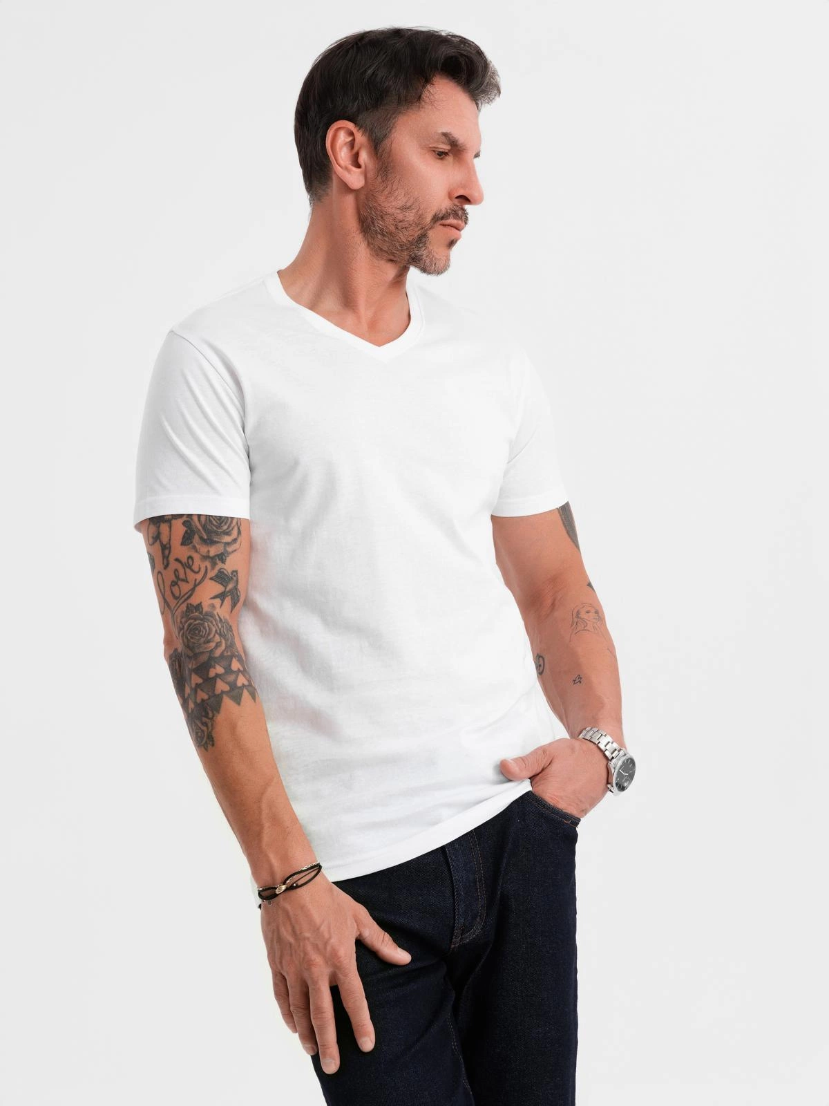 Ten bawełniany t-shirt z dekoltem w serek stanowi podstawę zróżnicowanych męskich stylizacji. To ponadczasowy model, który niezmiennie cieszy się popularnością wśród mężczyzn przez swoje szerokie modowe zastosowanie oraz funkcjonalność. Uszyty jest z jerseyowej bawełny, która sprawia, że koszulka jest miękka i przyjemna w dotyku. Prosty krój powoduje, że t-shirt układa się na ciele jak druga skóra, podkreślając atuty sylwetki.