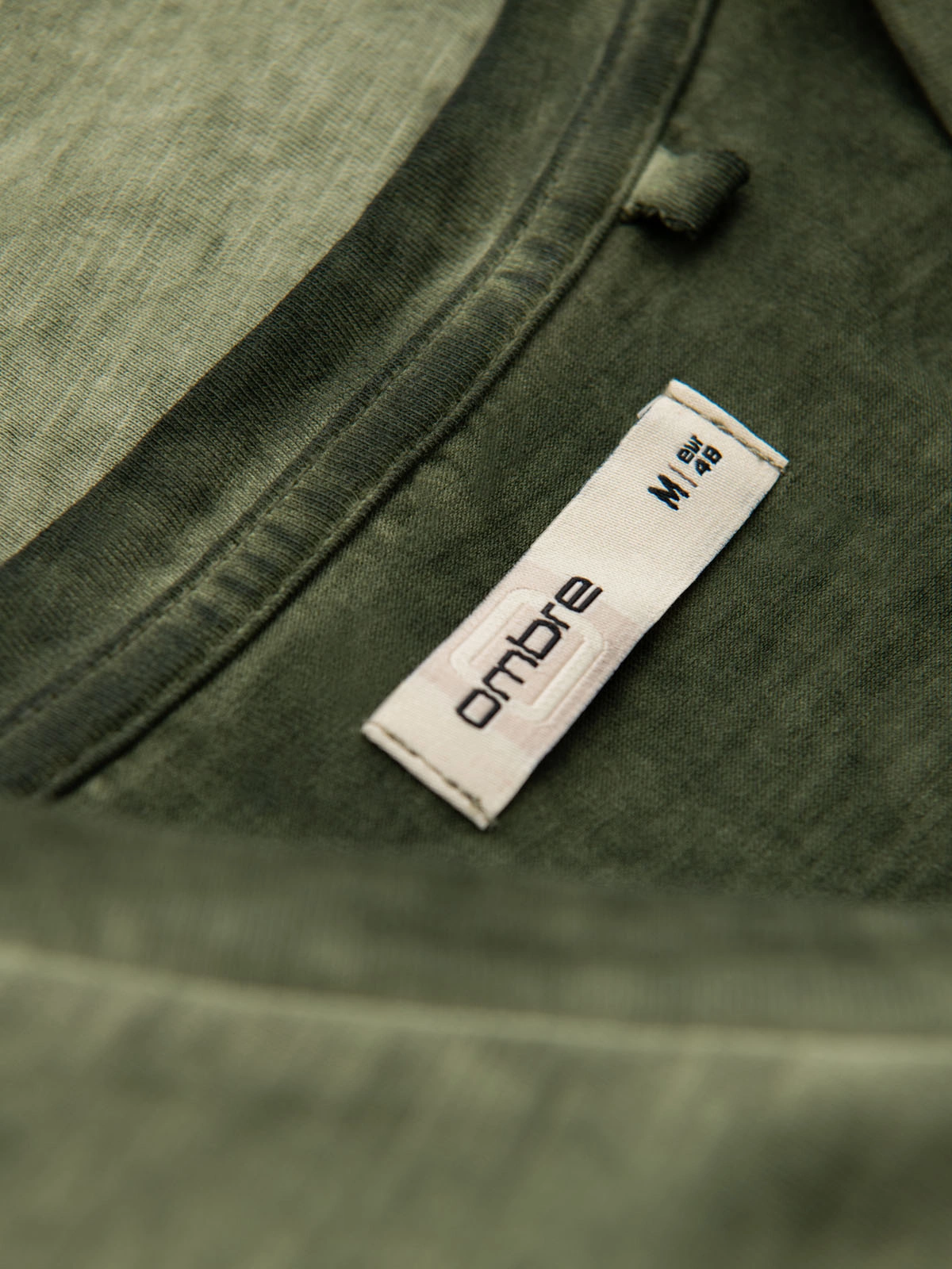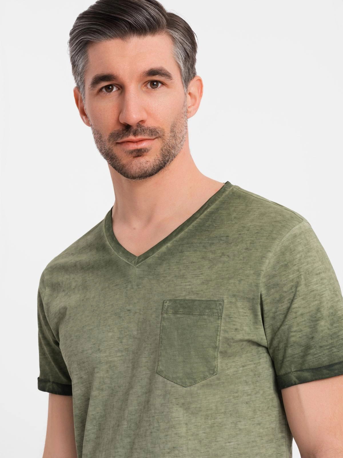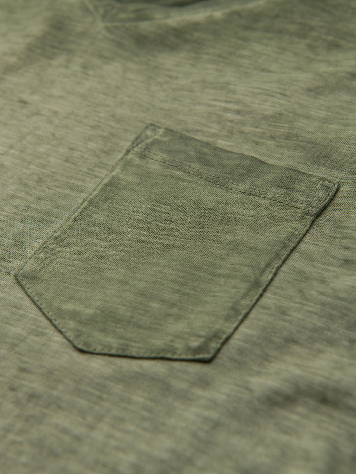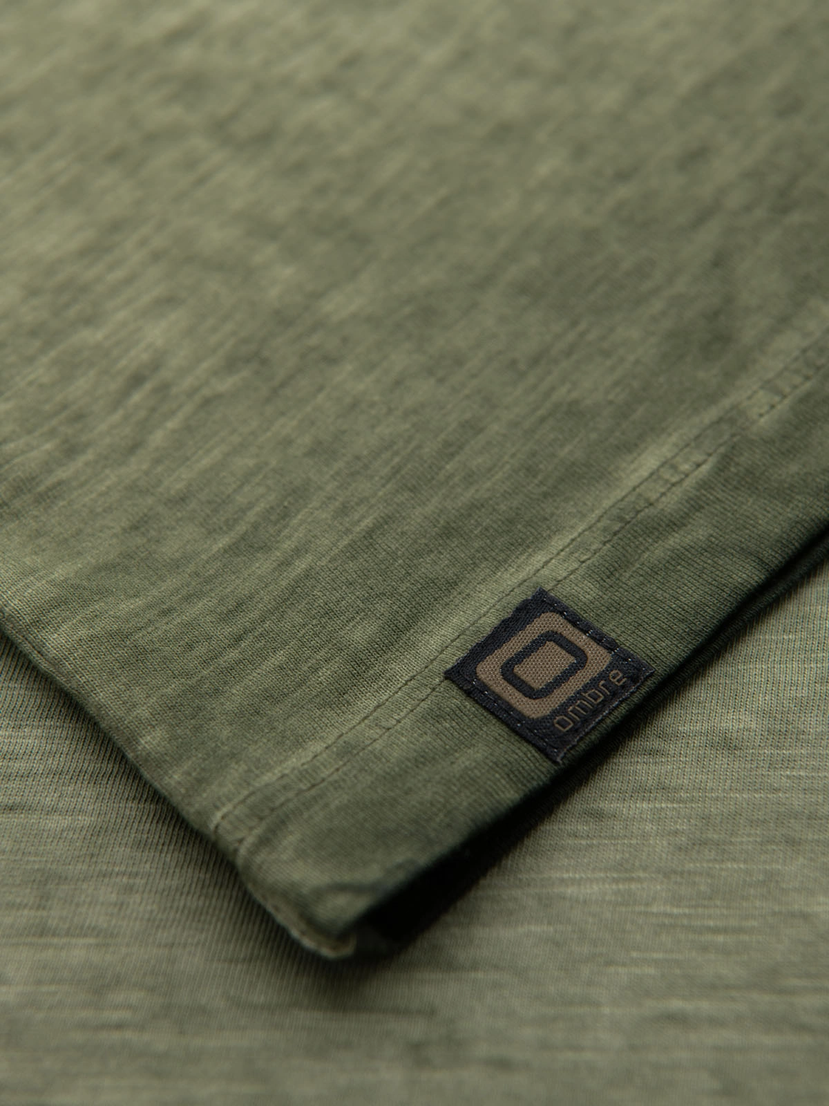 Koszulka męska o klasycznym kroju z dekoltem w serek, wykonana z przyjemnej w dotyku dzianiny bawełnianej typu slub jersey. Delikatnie melanżowa struktura z efektem sprania nadaje całości luźny, nieformalny charakter. Model posiada kieszonkę na piersi oraz subtelnie podwinięte rękawy, co podkreśla swobodny styl codzienny. Lekkie washowanie przywodzące na myśl estetykę vintage, doda pikanterii i indywidualizmu do stonowanych casualowych zestawów.