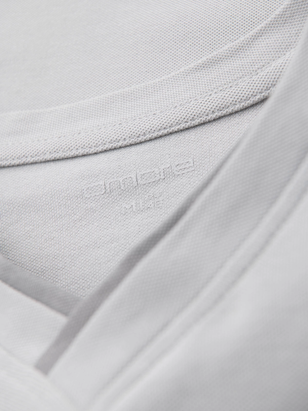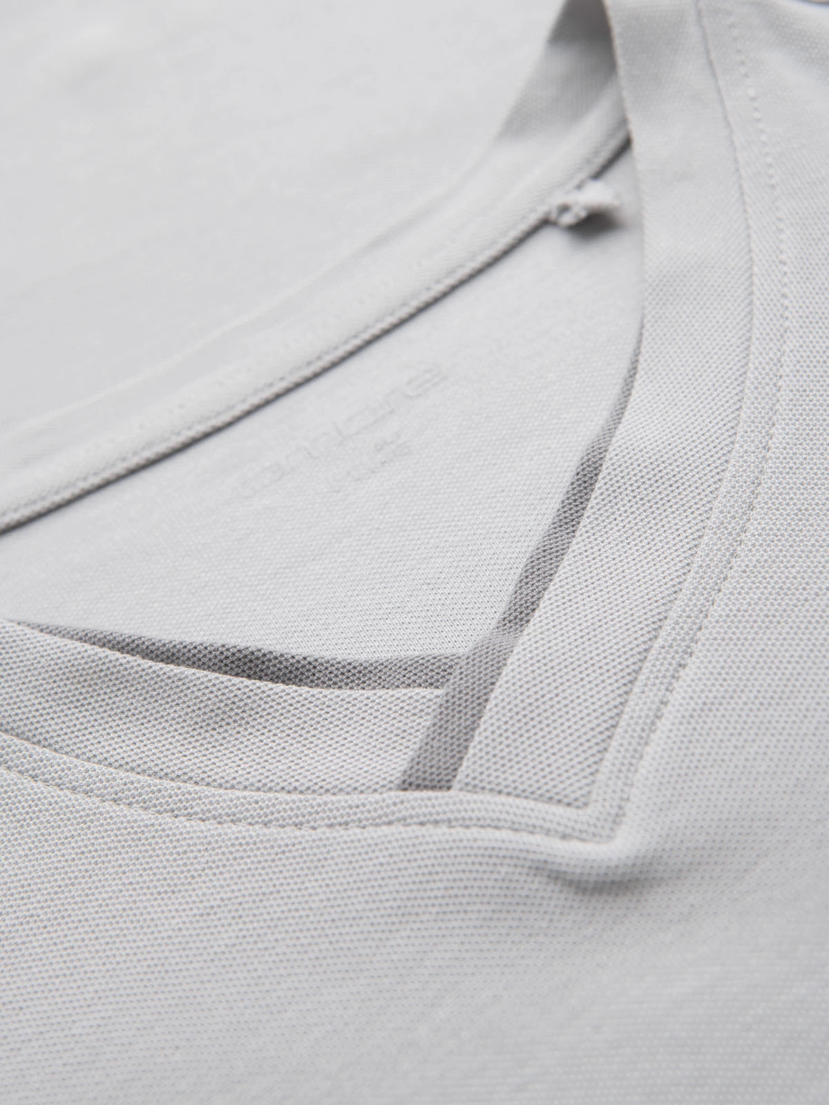 Uniwersalny T-shirt męski o swobodnym kroju, wykonany z wysokogatunkowej dzianiny pique. Struktura materiału nadaje koszulce nieco sportowego charakteru, jednocześnie pozostając wygodną w stylu casual. Wyróżniają ją kontrastowe, kolorystyczne wstawki przy dekolcie w serek oraz na rękawach, które przyciągają wzrok i dodają stylizacji wyrazistości. To propozycja dla mężczyzn ceniących komfort, jakość i detale.
