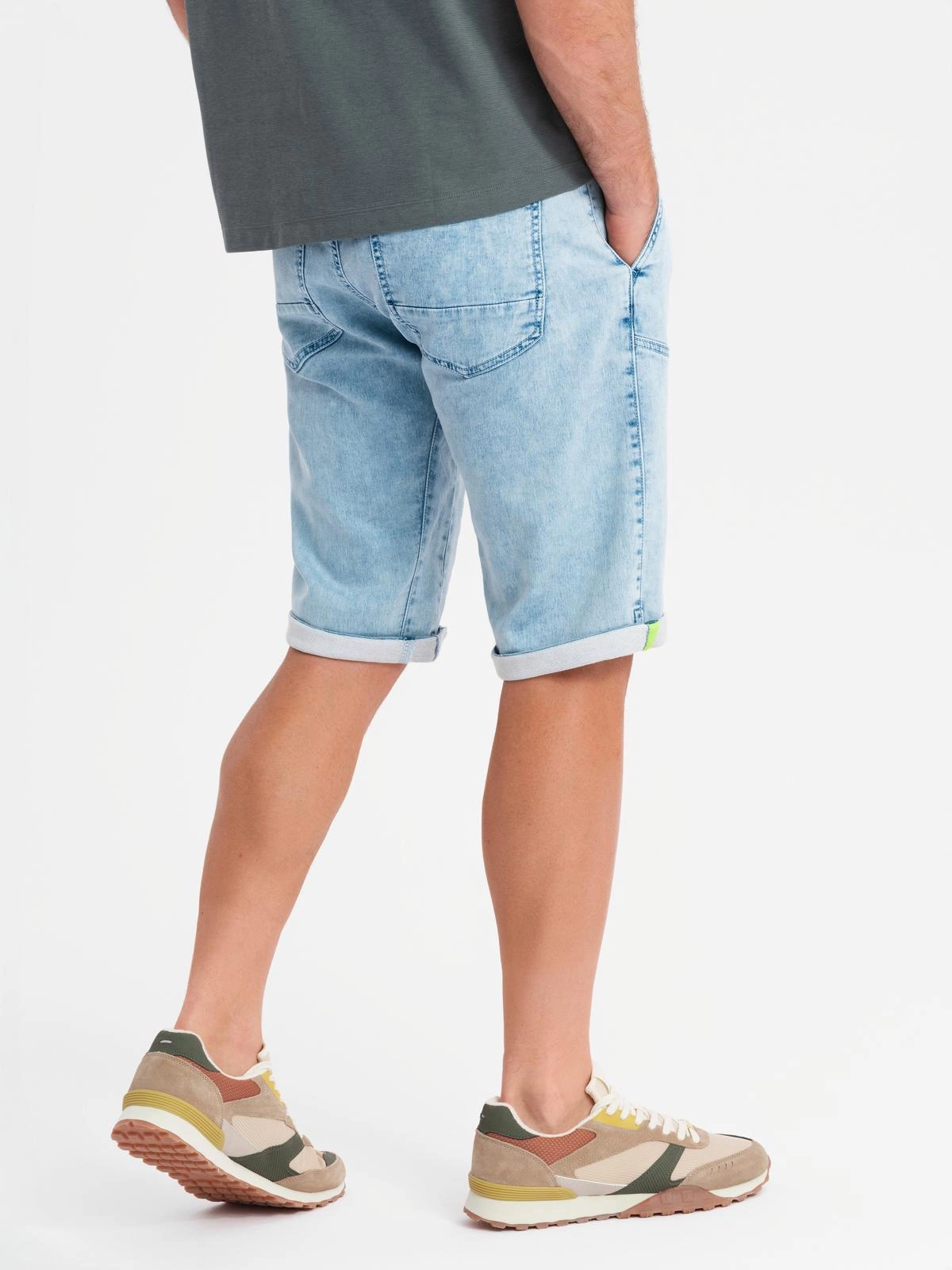 Męskie szorty z elastycznego denimu to idealne połączenie wygody i stylu streetwear. Miękki materiał z efektem sprania zapewnia komfort noszenia w każdej sytuacji, a dekoracyjne przeszycia i podwinięta nogawka dodają im miejskiego charakteru. Szorty wyposażone są w praktyczne kieszenie i elastyczną talię ze sznurkiem do regulacji, dzięki czemu dopasowują się do sylwetki. Model doskonale sprawdzi się zarówno w wakacyjnych stylizacjach, jak i na co dzień.