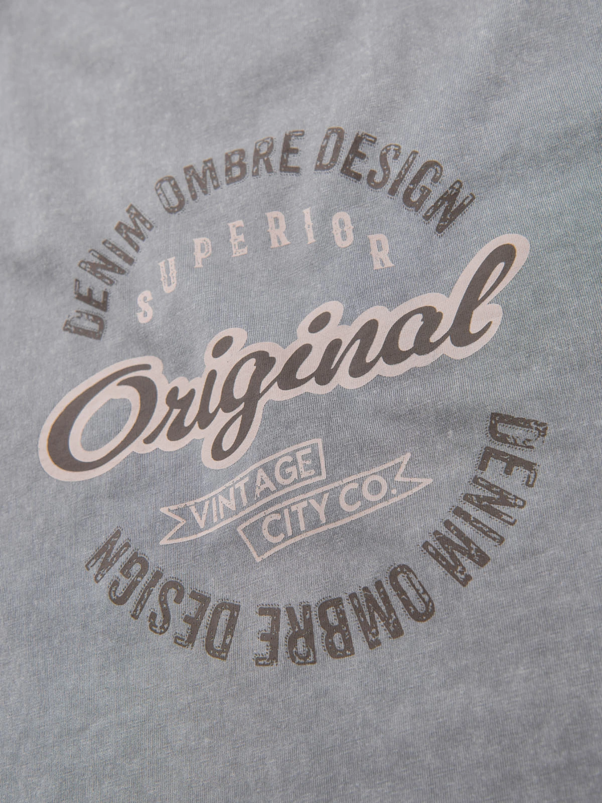 T-shirt o klasycznym kroju regular, wykonany z miękkiej dzianiny single jersey z wysokogatunkowej bawełny czesanej. Subtelny efekt washowania nadaje materiałowi delikatną stylistyke vintage. Printy w stylu denimowym dodają charakteru, tworząc codzienną, nowoczesną propozycję dla mężczyzn szukających wygody i stylu.