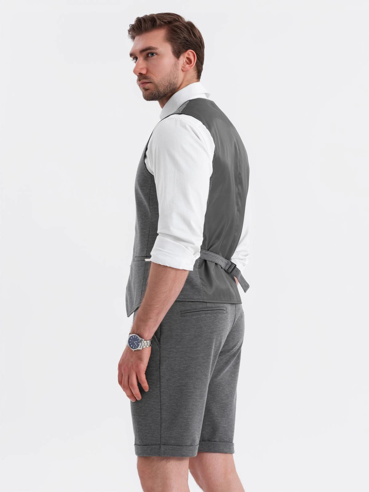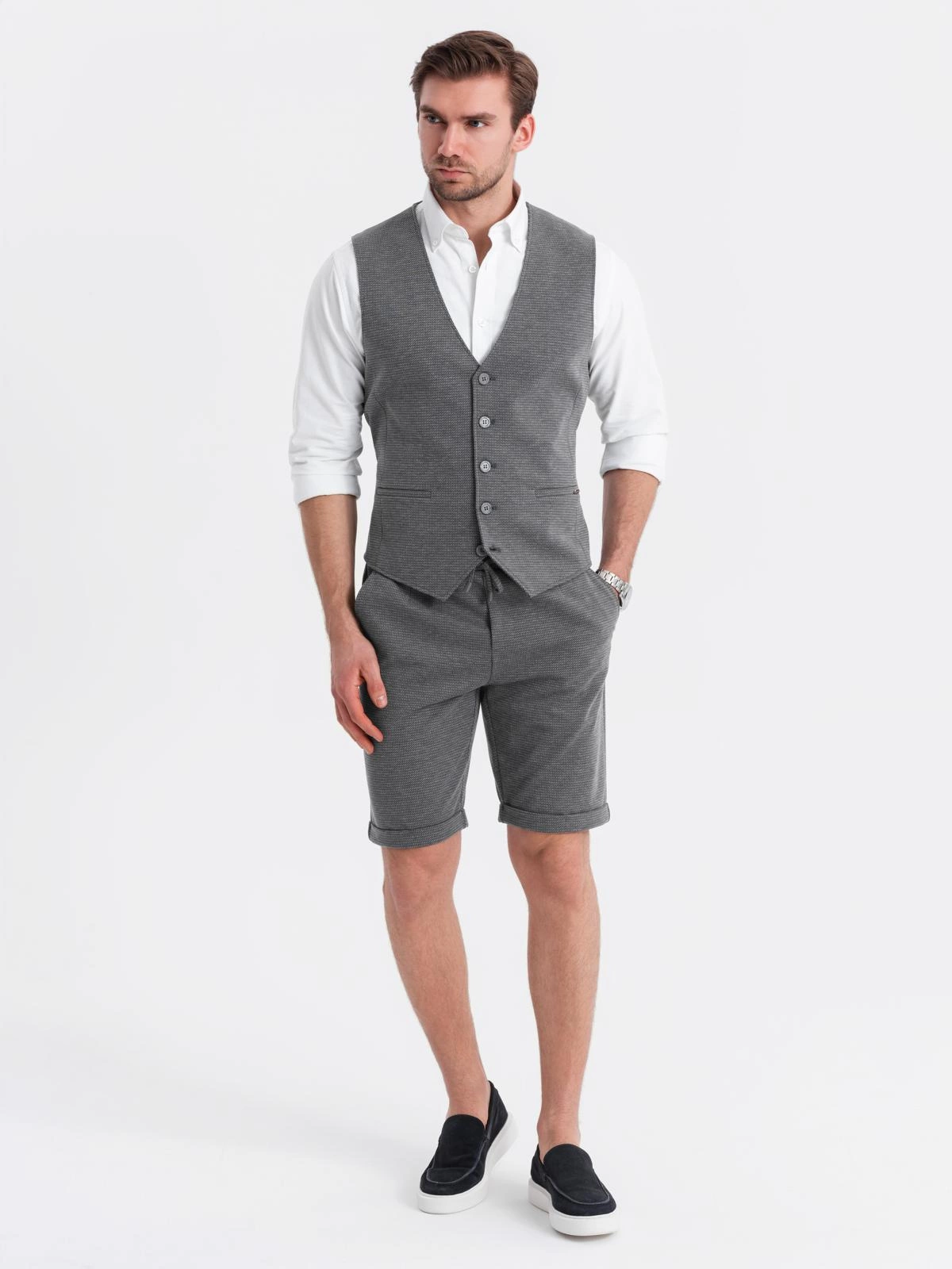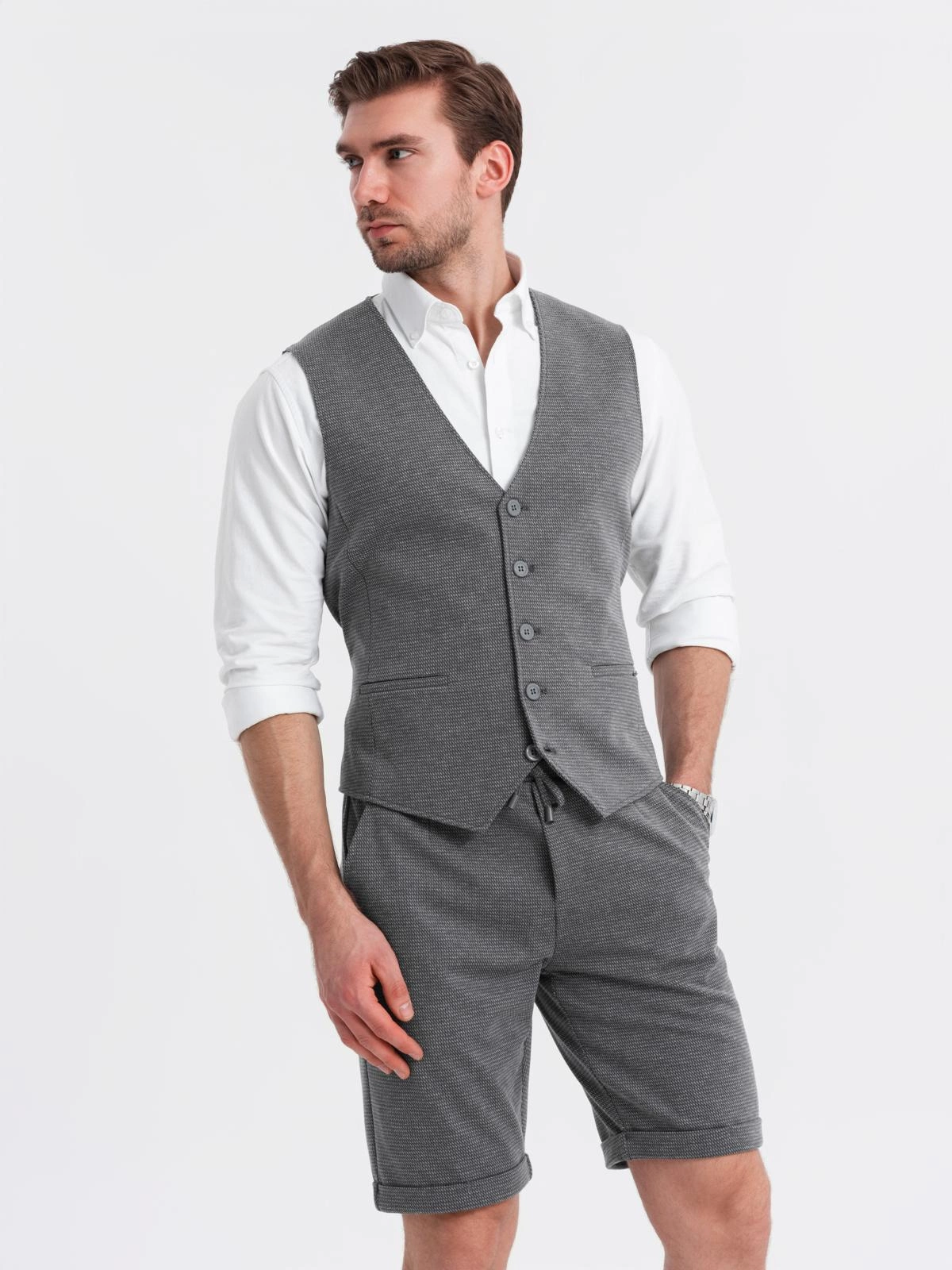Elegancja i luz w nowoczesnym wydaniu – ten zestaw z kolekcji QUINTESSENCE to propozycja dla mężczyzn, którzy cenią klasę bez rezygnacji z komfortu. Kamizelka o dopasowanym kroju i klasyczne szorty tworzą spójną, stylową całość. Charakterystyczna struktura dzianiny oraz subtelne detale sprawiają, że komplet doskonale sprawdzi się zarówno na co dzień, jak i podczas nieformalnych letnich okazji.