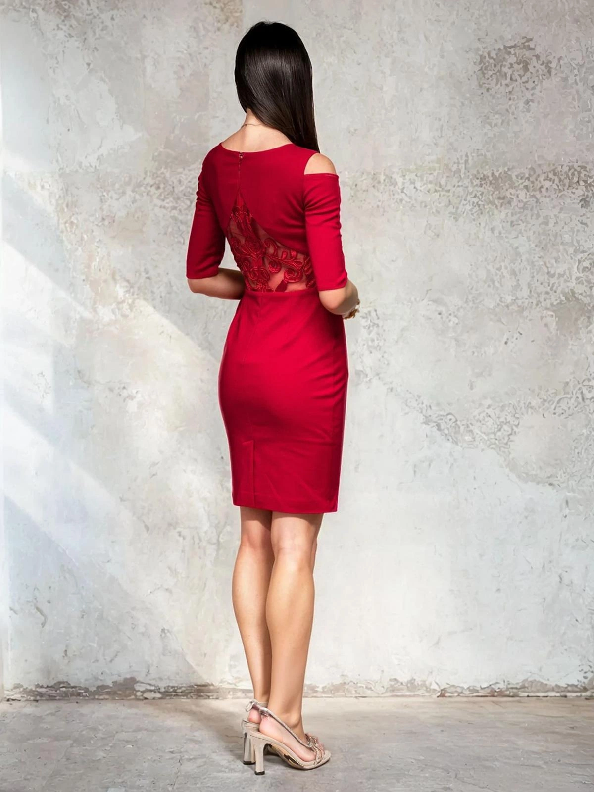 Ta efektowna sukienka damska mini to propozycja, która zachwyca elegancją i kobiecym charakterem. Ozdobny, okrągły dekolt z koronkowymi wstawkami subtelnie podkreśla linię ramion, nadając całości wyjątkowego szyku. Sukienka wykonana została z przyjemnej w dotyku tkaniny, dzięki czemu gwarantuje komfort oraz doskonałe dopasowanie do sylwetki. Idealnie sprawdzi się na wesele, randkę czy wieczorne wyjście, kiedy chcesz wyglądać elegancko i zmysłowo. To klasyczny fason, który łatwo zestawisz z delikatnymi szpilkami i elegancką biżuterią.