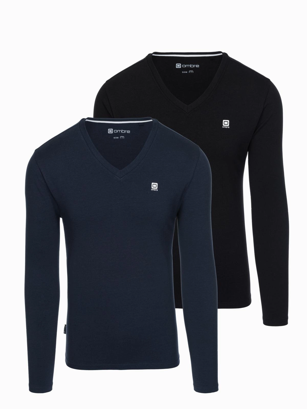Komplet męskich longsleeve'ów SLIM FIT z dekoltem typu V i logotypem 2-pak – mix granatowy/czarny V3 Z103