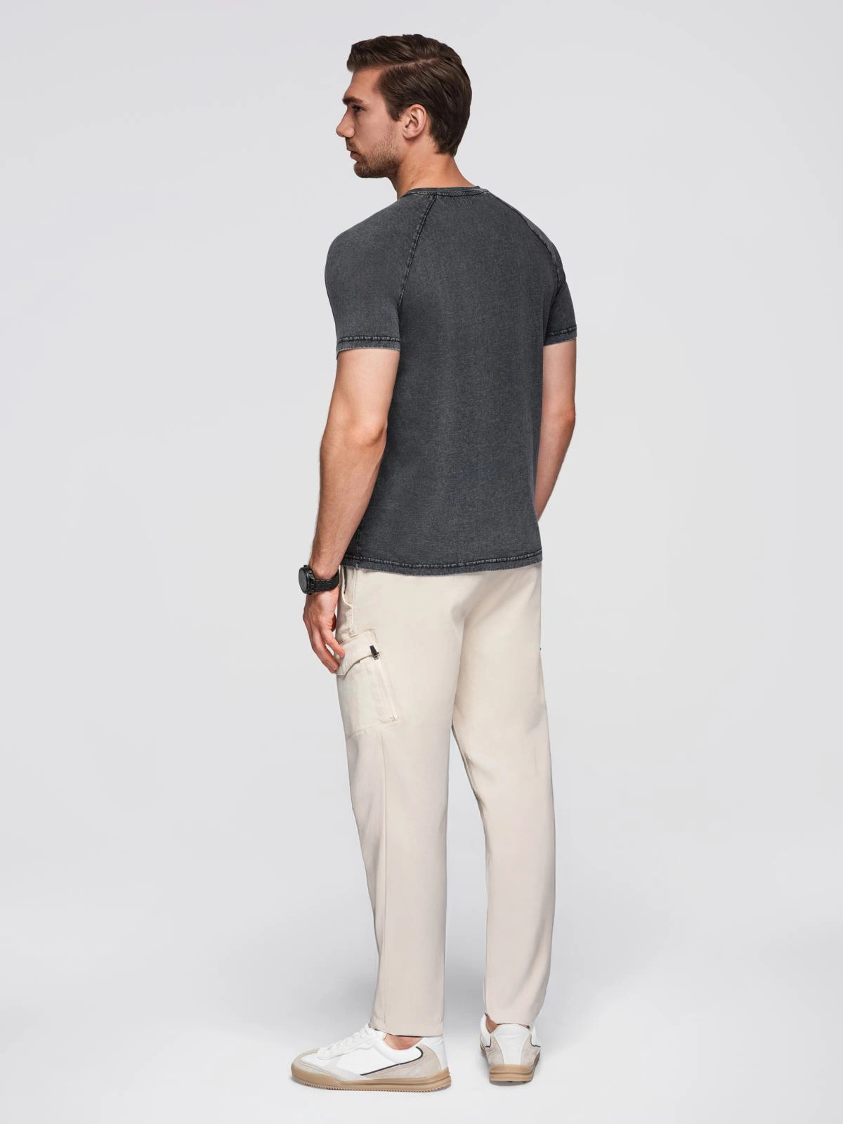 Stylowy i komfortowy – ten T-shirt to must-have w garderobie mężczyzny, który ceni sobie modny wygląd i wygodę na co dzień. Cieniowana dzianina bawełniana nadaje mu niepowtarzalny, lekko vintage’owy charakter. Rozpinany dekolt i raglanowe rękawy dodają mu swobodnego stylu, idealnego na letnie dni i weekendowe wyjścia.