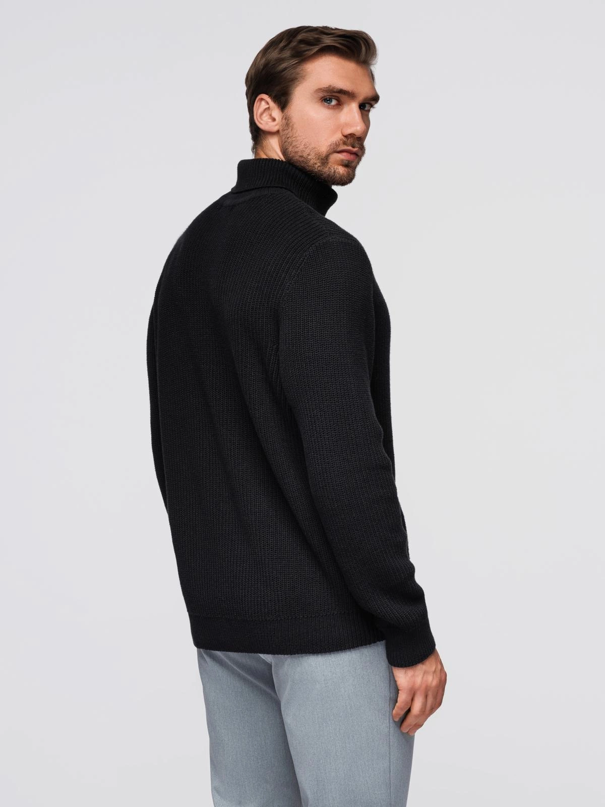 Ponadczasowy klasyczny sweter męski z golfem z linii Ombre Quintessence to must-have w sezonie jesienno-zimowym. Został wykonany z wysokiej jakości 100% bawełny o grubszym splocie w prążek, co zapewnia zarówno komfort termiczny, jak i elegancki wygląd. Regularny krój świetnie dopasowuje się do sylwetki, a ściągacze na rękawach i dole dodają mu funkcjonalności i klasy. Subtelny metalowy pin z brandingiem przy dolnej krawędzi podkreśla unikalny charakter produktu. Golf doskonale sprawdzi się w stylizacjach do biura, jak i na mniej formalne okazje.