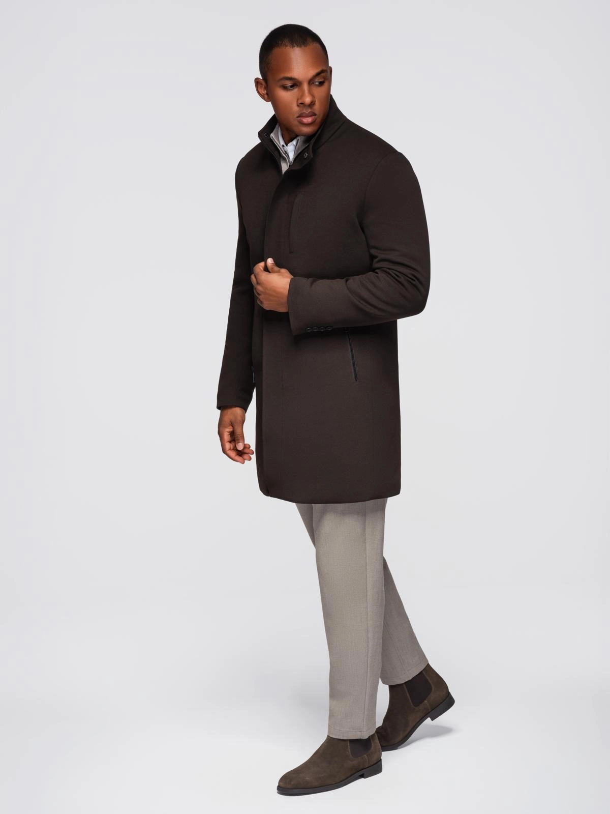 Długi męski płaszcz z wysokim kołnierzem z kolekcji Ombre Quintessence cechuje się niebanalnym designem. Stylowy krój z wysokim kołnierzem oraz tkanina o wyczuwalnej strukturze sprawia, że płaszcz zyskuje nowoczesny wygląd. Zapinane kieszenie pełnią nie tylko rolę użytkową, ale także gustownie zdobią płaszcz, dodając mu unikalnego charakteru. Okrycie w jednolitej, stonowanej kolorystyce uświetni zarówno stylizacje codzienne, jak i na specjalne okazje.