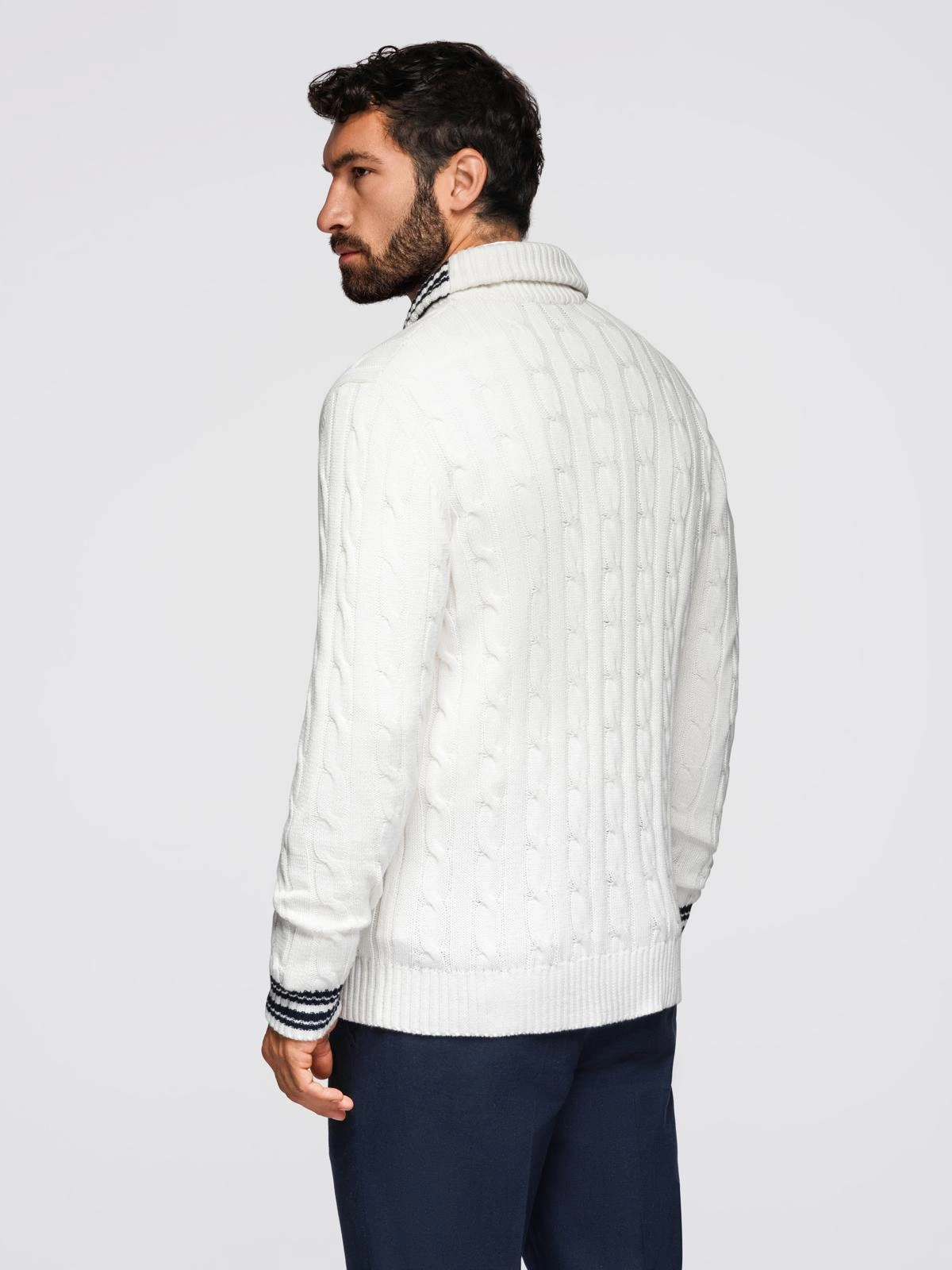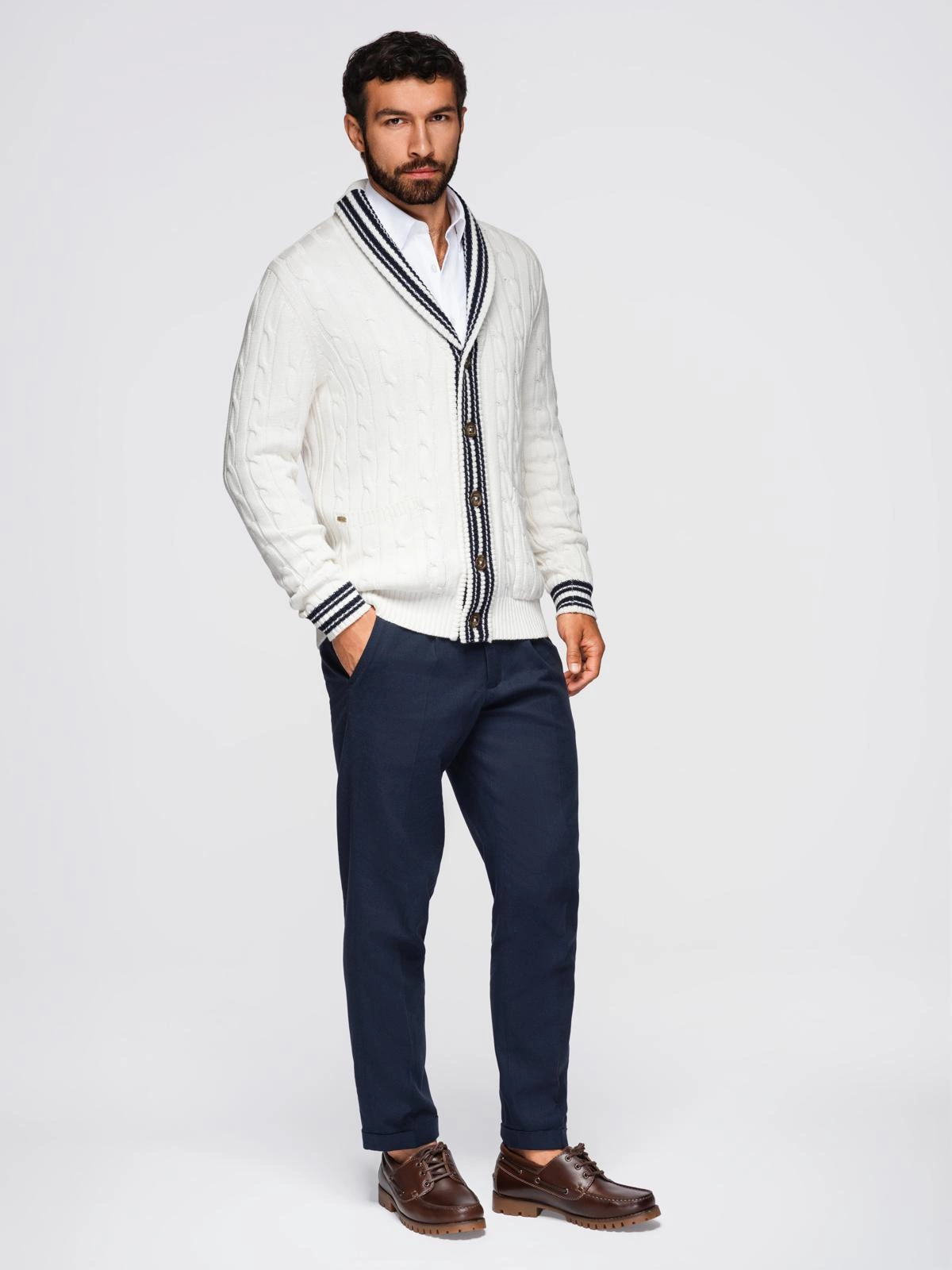 Kardigan z kolekcji Ombre Heritage łączy klasyczną elegancję z nowoczesnym wykończeniem. Wykonany z wysokiej jakości bawełny, posiada splot warkoczowy, kontrastowe detale przy mankietach, plisie i kołnierzu oraz ozdobne brandowane guziki. Stylowy szalowy kołnierz i metalowy pin z logo marki dodają mu unikatowego charakteru.