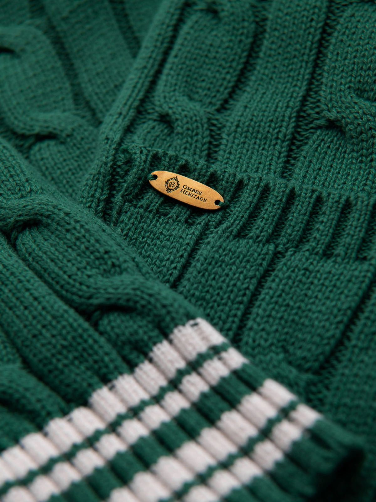 Kardigan z kolekcji Ombre Heritage łączy klasyczną elegancję z nowoczesnym wykończeniem. Wykonany z wysokiej jakości bawełny, posiada splot warkoczowy, kontrastowe detale przy mankietach, plisie i kołnierzu oraz ozdobne brandowane guziki. Stylowy szalowy kołnierz i metalowy pin z logo marki dodają mu unikatowego charakteru.