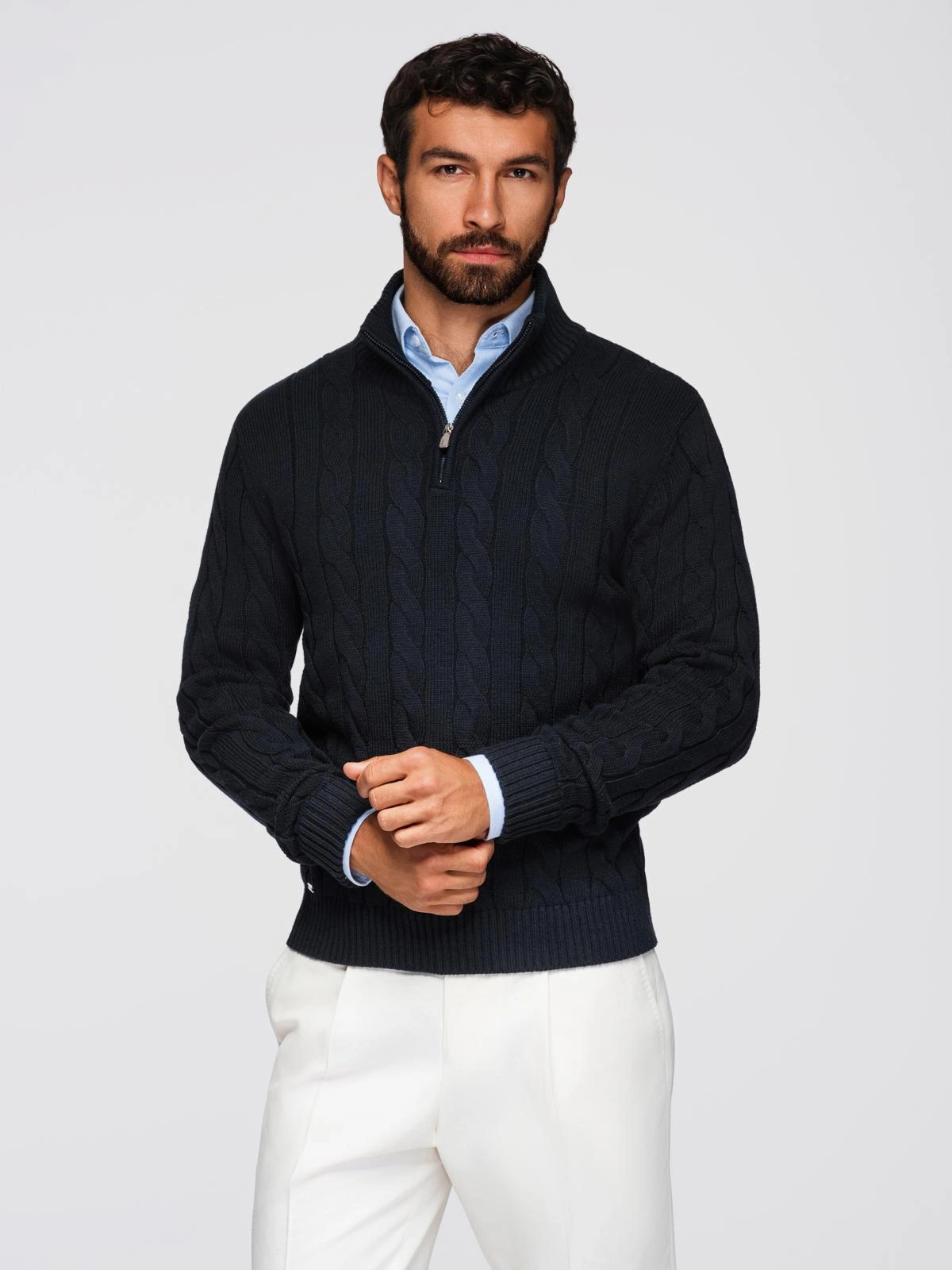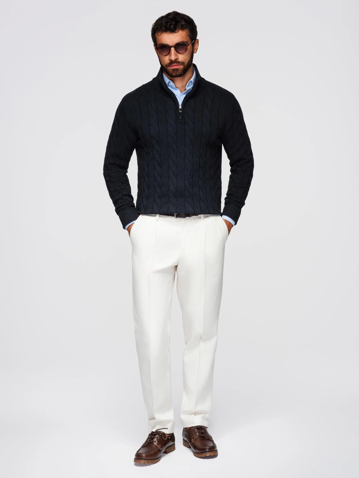 Sweter, który łączy elegancję z codziennym komfortem. Model z linii Quintessence to stylowa propozycja dla mężczyzn ceniących klasyczne wzornictwo w nowoczesnym wydaniu. Warkoczowy splot i zamek w golfie sprawiają, że świetnie sprawdzi się zarówno w casualowych stylizacjach, jak i w bardziej eleganckich zestawach – np. z koszulą i krawatem. Całość dopełnia subtelny, metalowy pin przy dolnym ściągaczu.