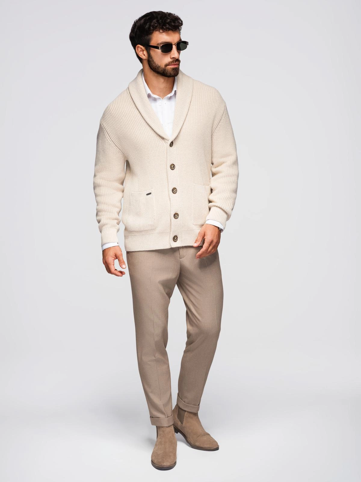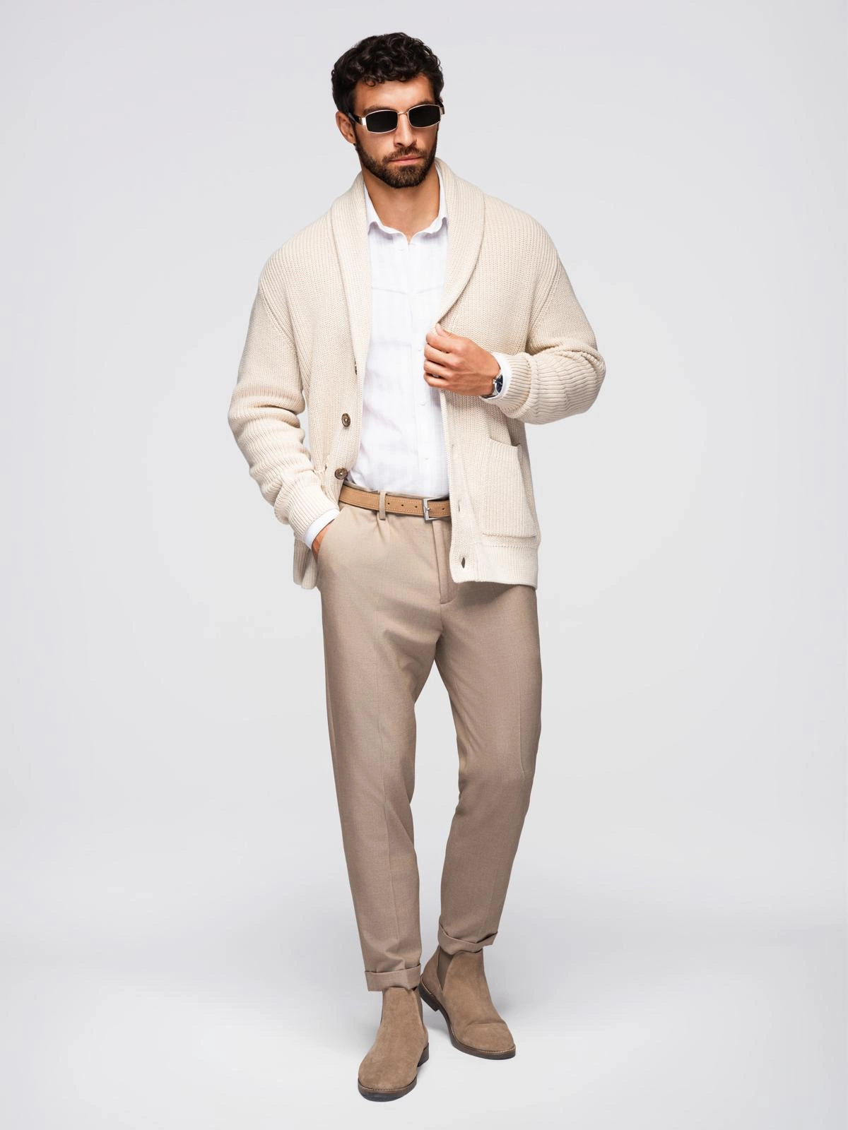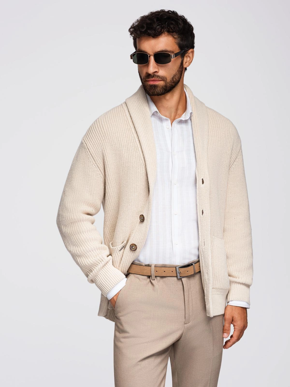 Stylowy kardigan marki Ombre Quintessence to doskonały wybór dla mężczyzn ceniących komfort i elegancję. Wykonany z przyjemnej w dotyku dzianiny z czystej bawełny, posiada charakterystyczny szalowy kołnierz i naszywane kieszenie. Klasyczny fason regular oraz gładki splot sprawiają, że sweter idealnie sprawdzi się zarówno w codziennych, jak i bardziej eleganckich stylizacjach. Detale, takie jak brandowane guziki i metalowy pin, dodają mu nowoczesnego sznytu.