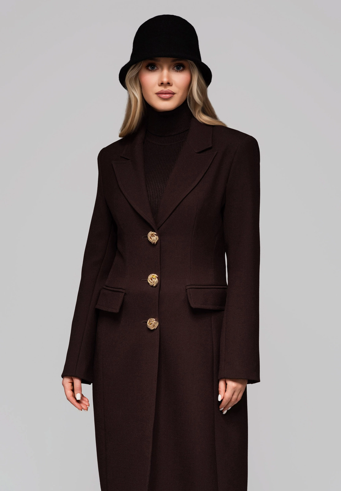 Płaszcz damski taliowany ze złotymi guzikami LARICA OW-COLC-0103 v2 - brązowy