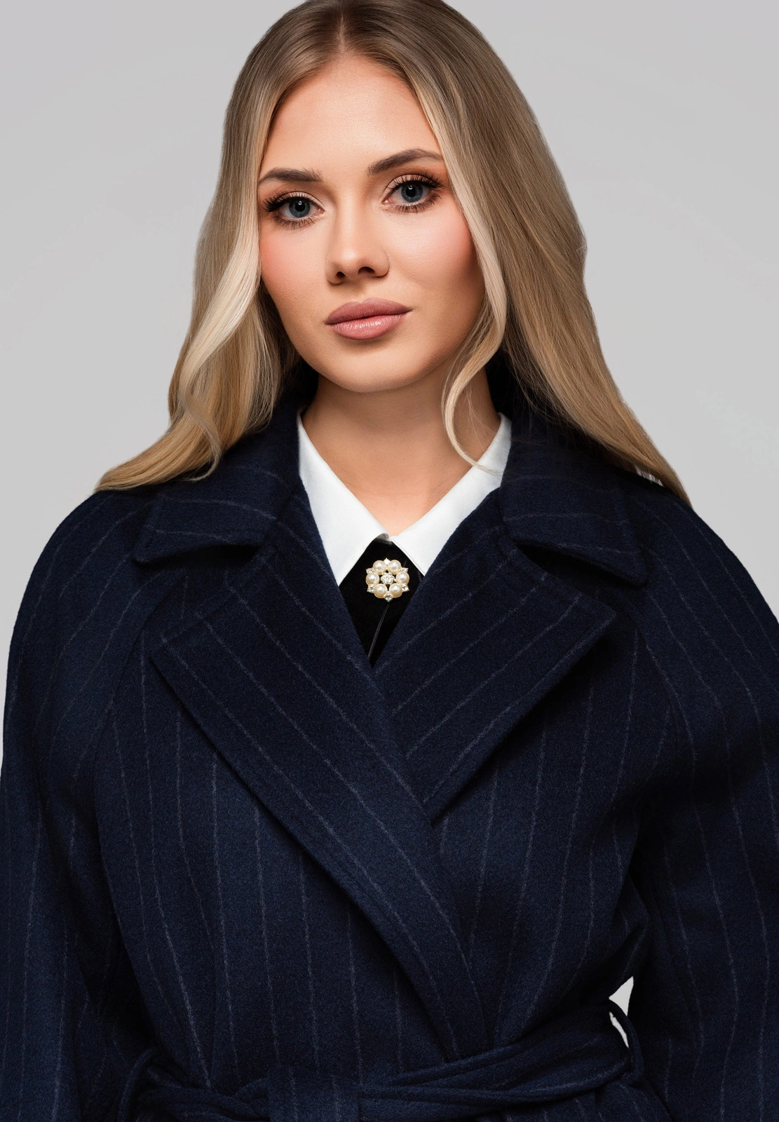 Elegancki, długi płaszcz szlafrokowy o luźniejszym, otulającym fasonie, który zapewnia maksymalną swobodę i komfort. Wykonany z solidnej mieszanki materiałowej - 50% naturalnej wełny i 50% poliestru - gwarantuje idealne połączenie ciepła i trwałości. Wyróżniają go charakterystyczne pionowe prążki oraz szerokie, podwijane mankiety. Płaszcz nie posiada tradycyjnego zapięcia, jest wiązany w talii szerokim paskiem, co pozwala na idealne dopasowanie i podkreślenie sylwetki. Posiada szeroki, otwarty kołnierz, który układa się kaskadowo, nadając całości nonszalanckiego szyku. To wyrafinowane okrycie wierzchnie, idealne dla kobiet ceniących wygodę i biznesową elegancję.