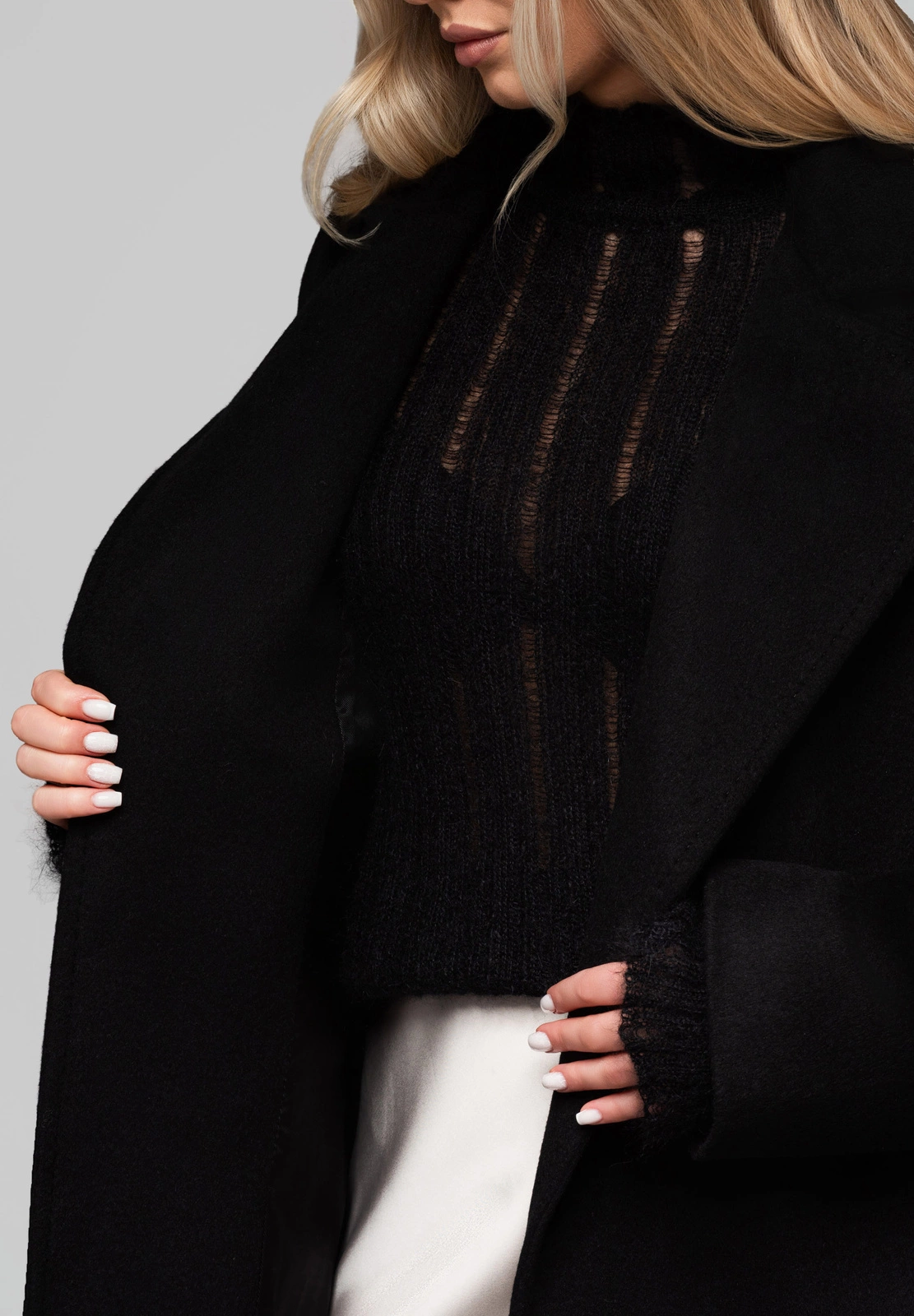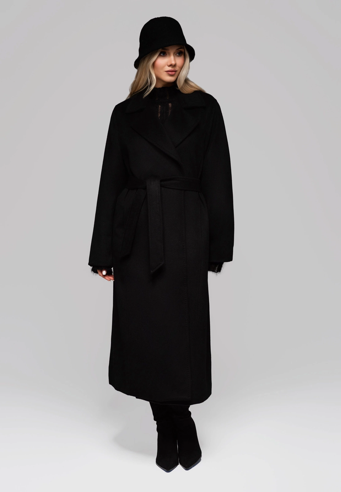 Luksusowy, długi płaszcz damski o prostym, minimalistycznym kroju. Wykonany z bogatej mieszanki tkanin, z wysoką zawartością naturalnej wełny (52,4%), co gwarantuje wyjątkową miękkość i ochronę przed chłodem. Charakteryzuje się brakiem tradycyjnego zapięcia – płaszcz jest otwarty, co tworzy efekt kaskadowej elegancji i ułatwia szybkie narzucenie go na każdą stylizację. Szeroki, układający się kołnierz tworzy ramę dla szyi, a prosta linia fasonu sprawia, że jest to ponadczasowy i uniwersalny element garderoby. Idealnie pasuje zarówno do casualowych zestawów z dzianinami, jak i do wieczorowych kreacji. To synonim ciepła i subtelnej, niewymuszonej elegancji.