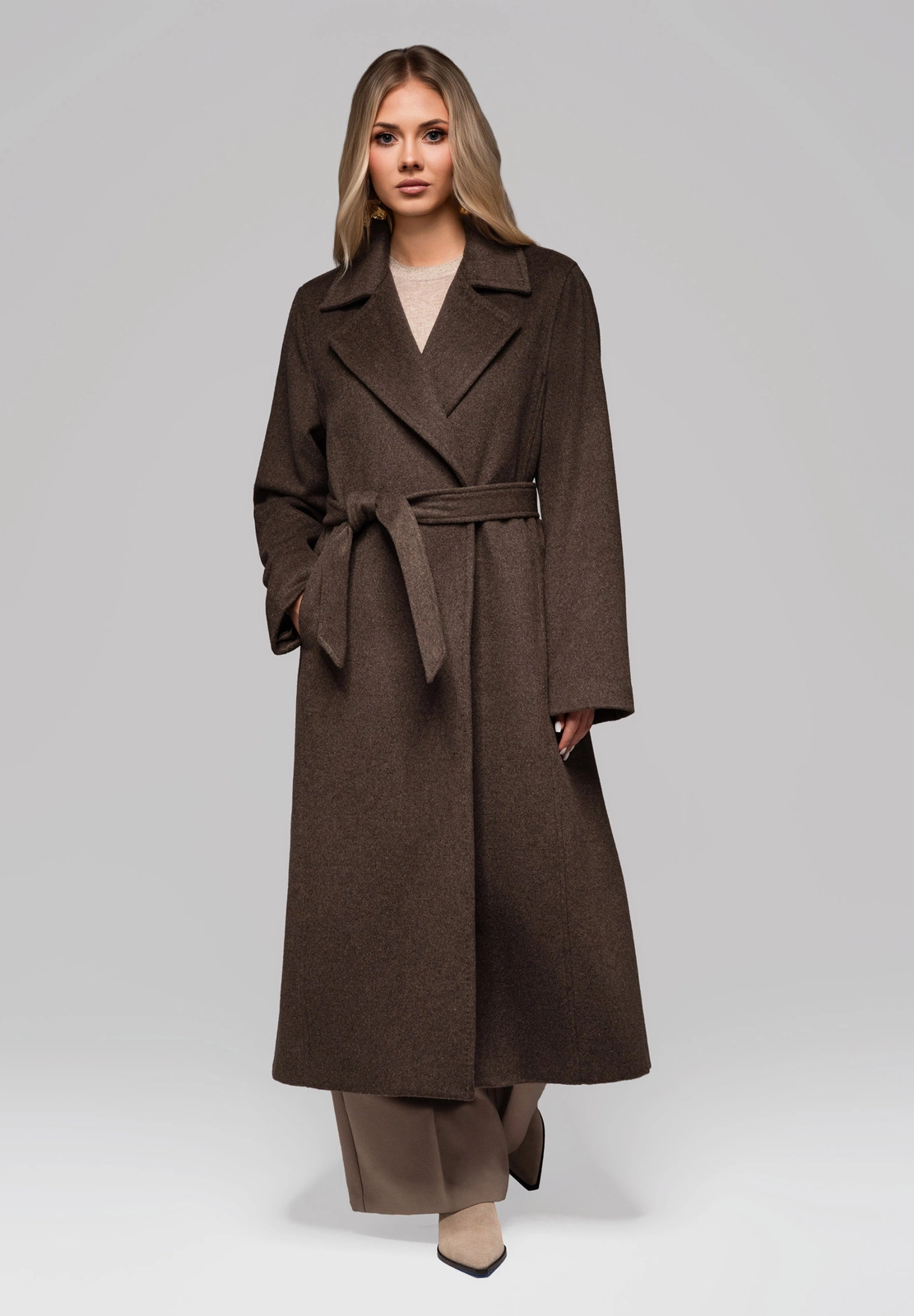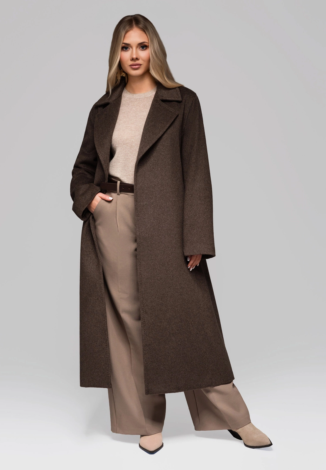 Luksusowy, długi płaszcz w stylu wrap coat (szlafrokowym), który otula i zapewnia maksymalny komfort cieplny. Materiał zewnętrzny to wysokiej jakości mieszanka z dominującą zawartością wełny (52,4%), wzbogacona poliestrem i wiskozą, charakteryzująca się delikatnym włoskiem. Wnętrze wyścielone jest podszewką z poliestru i wiskozy. Fason wyróżniają szerokie klapy kołnierza i brak tradycyjnego zapięcia – płaszcz jest wiązany w talii paskiem. Konstrukcja posiada praktyczne dodatki: dwie kieszenie sprytnie ukryte na linii cięcia, rozporek z tyłu dla swobody ruchu oraz dekoracyjne przeszycia wokół klap, podkreślające staranne wykończenie.