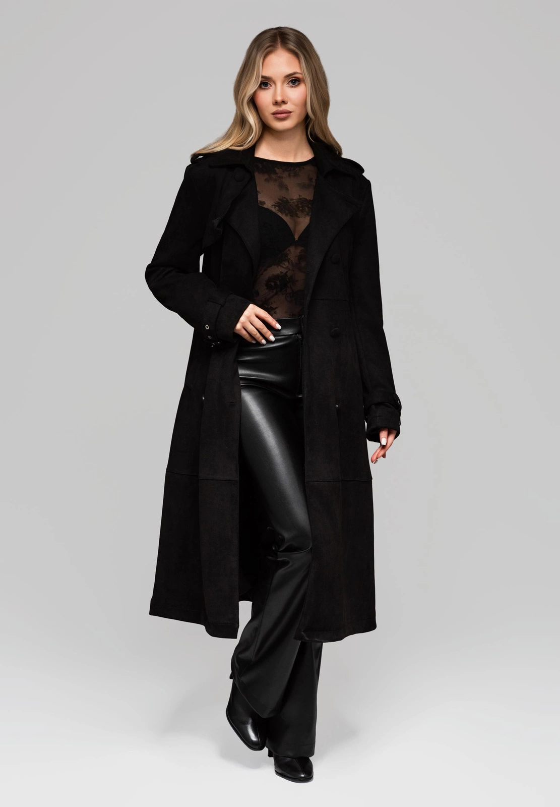 Elegancki, długi płaszcz o kroju trenczu, wykonany z tkaniny imitującej zamsz. Zarówno materiał zewnętrzny, jak i wewnętrzna podszewka to 100% poliester, co gwarantuje trwałość i gładkie wykończenie. Płaszcz charakteryzuje się klasycznym kołnierzem i jest jednolicie zapinany na guziki, które zostały estetycznie obciągnięte tym samym materiałem, co tkanina główna. Model wyposażono w szeroki pasek z klamrą do wiązania w talii oraz dodatkowe, dekoracyjne paski z klamrami przy mankietach. Konstrukcję wzbogacają ozdobne pagony na ramionach, zapinane na guziki, a także dodatkowe cięcia na materiale pełniące funkcję estetyczną. Płaszcz posiada dwie praktyczne kieszenie.