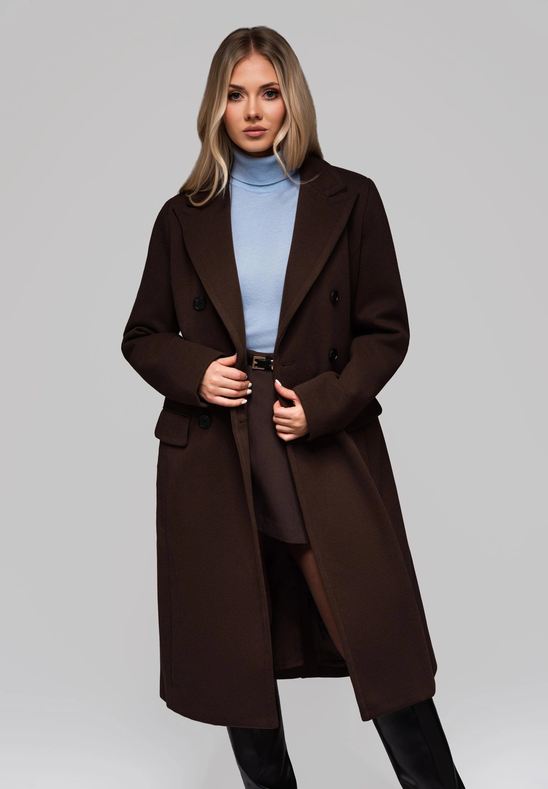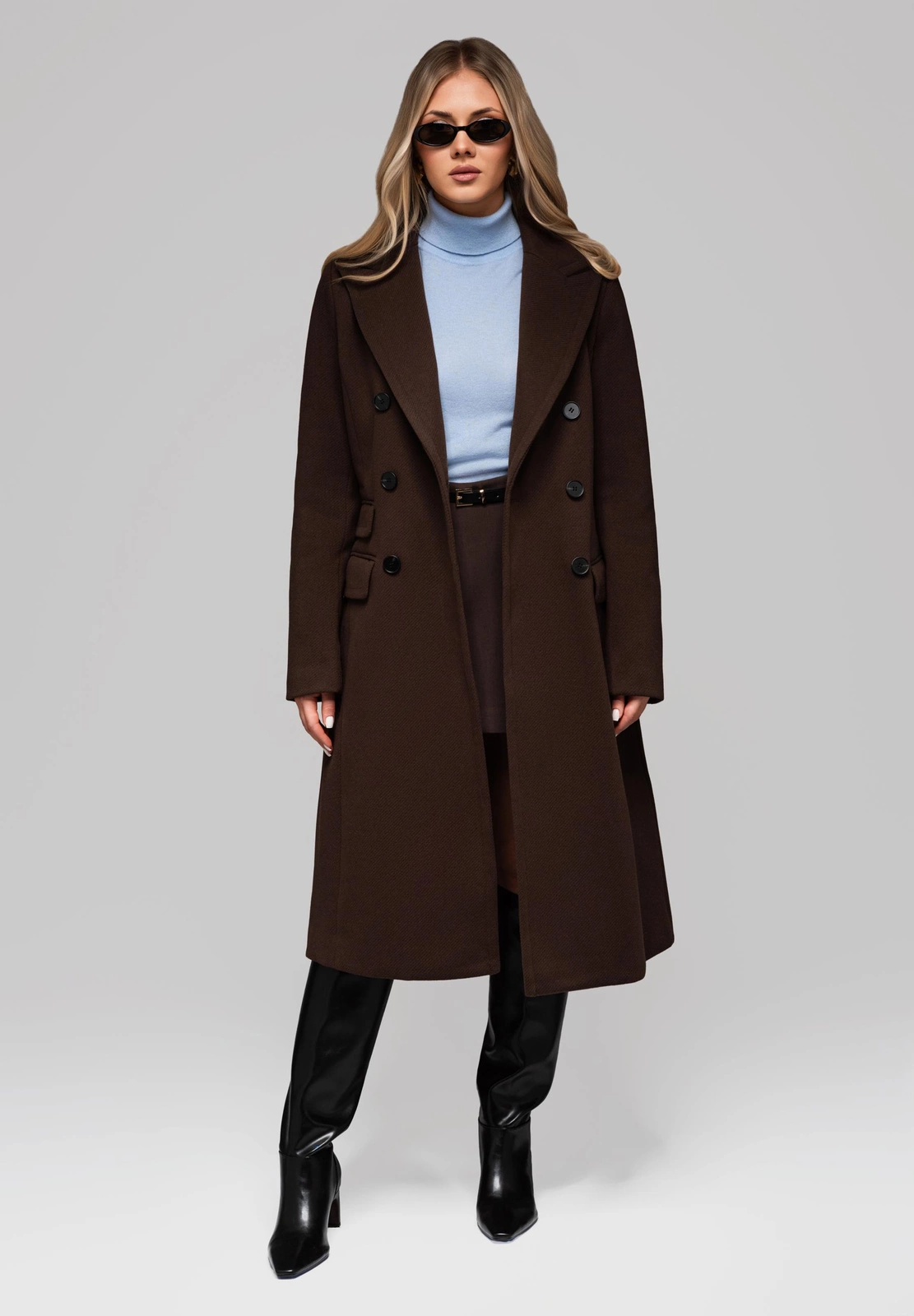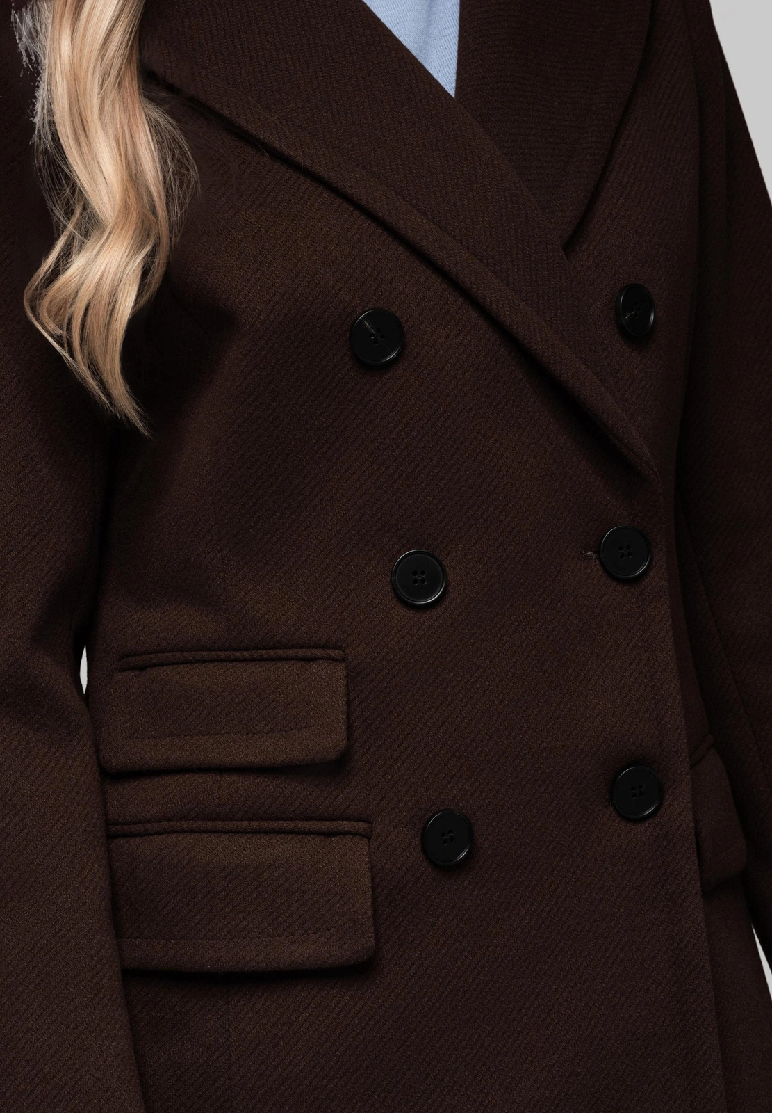 Klasyczny płaszcz o dwóch rzędach guzików i delikatnie dopasowanym kroju, który subtelnie modeluje sylwetkę. Całość, zarówno materiał zewnętrzny, jak i wewnętrzna podszewka, wykonana jest ze 100% poliestru. Tkanina posiada charakterystyczną strukturę ze skośnym splotem. Płaszcz zapinany jest na rząd kontrastujących guzików, które stanowią wyrazisty element dekoracyjny. Konstrukcja zawiera rozporek z tyłu, ułatwiający chodzenie, oraz dwie funkcjonalne kieszenie z klapami. Dodatkowo, na przodzie umieszczono jedną imitację kieszeni z klapą, która wzbogaca estetykę fasonu.