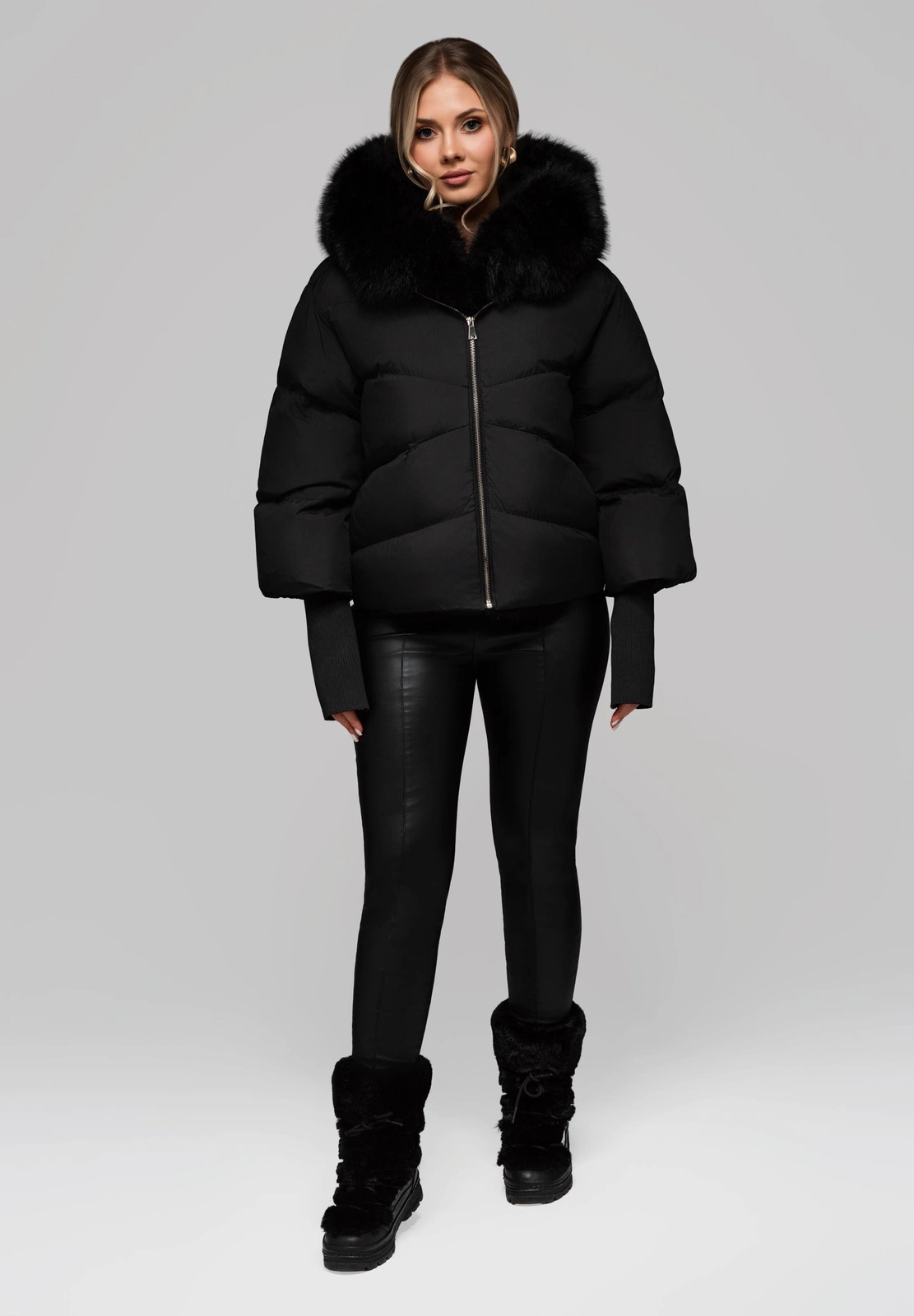 Funkcjonalna, krótka kurtka o klasycznym kroju, z obszernym kapturem. Charakteryzuje się dużą ilością sztucznego wypełnienia, zapewniając wysoki komfort cieplny. Model posiada unikalny rękaw o długości 3/4, zakończony wysokim ściągaczem, co stanowi zarówno element ozdobny, jak i praktyczny. Materiał zewnętrzny i wewnętrzny to 100% poliester, o gładkim, matowym wykończeniu. Kurtka zapinana jest na solidny, metalowy zamek. Detale obejmują odpinane futerko przy kapturze oraz futerko dopinane wzdłuż zapięcia. Funkcjonalność podnoszą dwie kieszenie zapinane na zamek kryty.