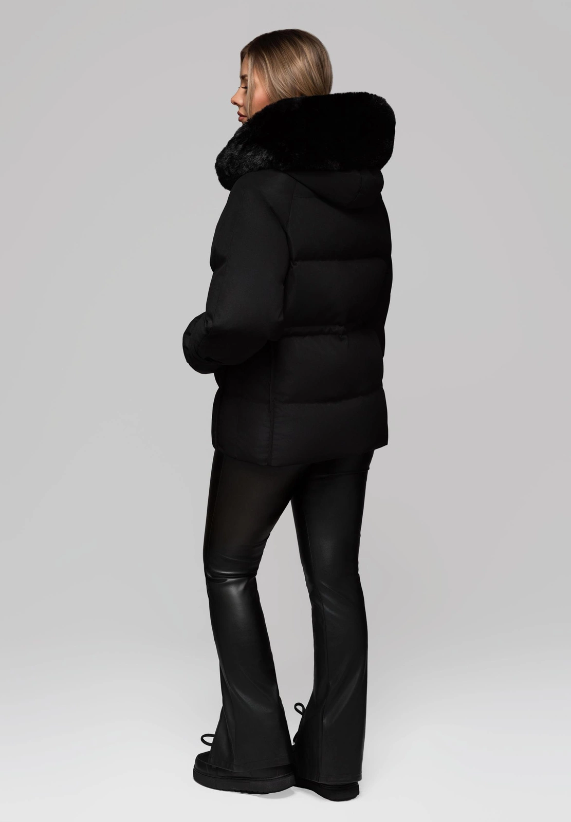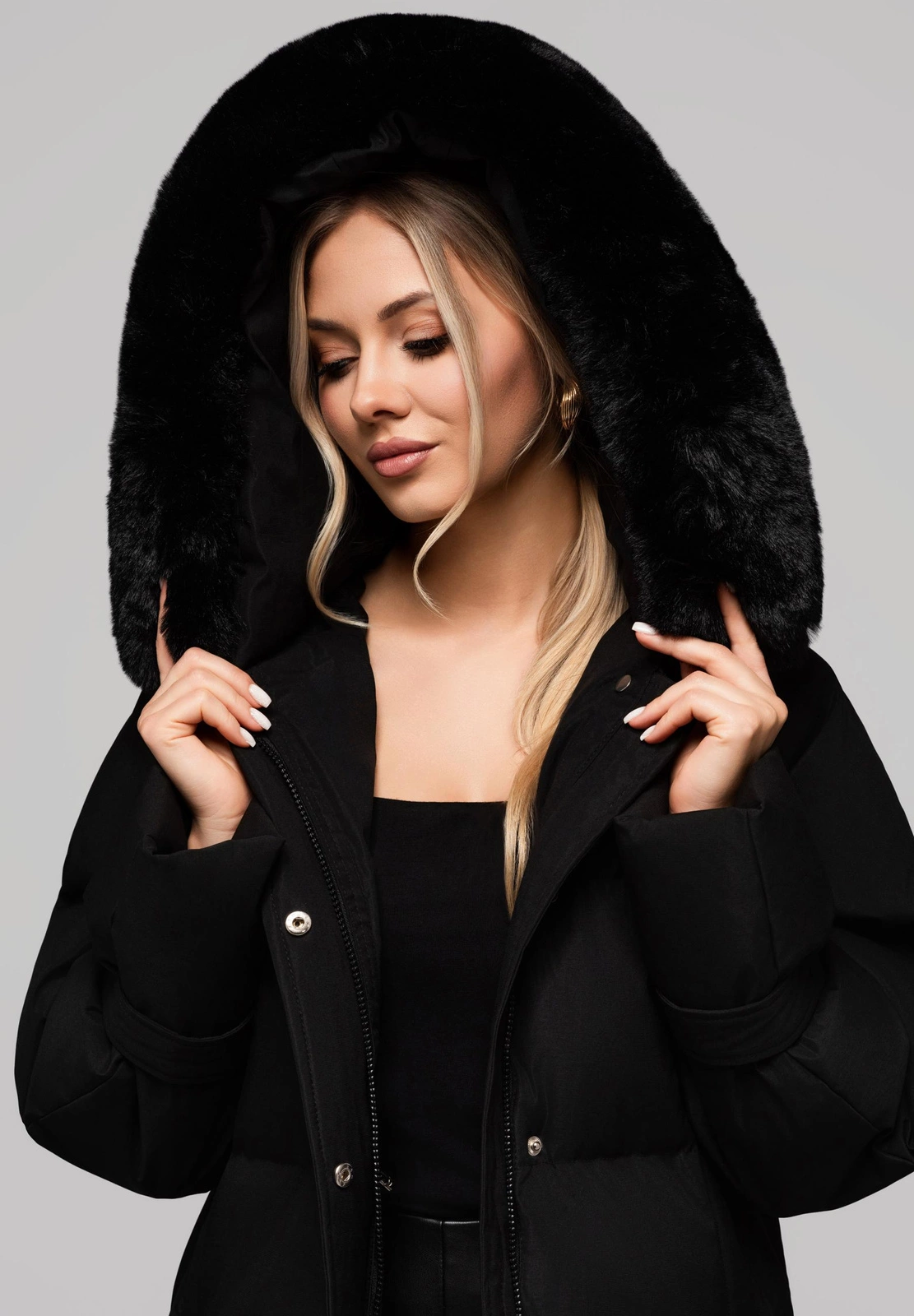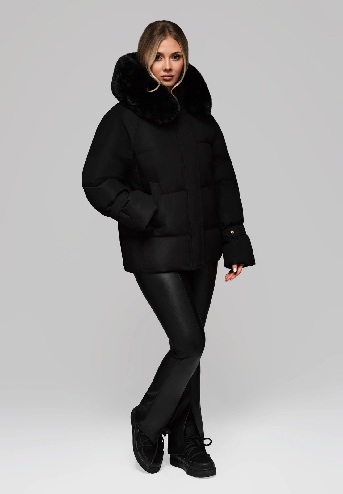 Funkcjonalna, krótka kurtka o luźniejszej linii, podkreślonej rękawem typu raglan (wszywanym skośnie od kołnierza). Model wyposażony jest w kaptur i ma dużą ilość sztucznego wypełnienia, zapewniającego wysoki komfort cieplny. Kurtka jest wykonana z gładkiej, matowej tkaniny poliestrowej. Zapinana jest na solidny zamek kostkowy, który jest dodatkowo kryty patką zapinaną na napy. Detale obejmują odpinane futerko przy kapturze, ozdobną wypustkę po bokach kurtki oraz dekoracyjne paski przy rękawach, zapinane na srebrne zatrzaski. Wewnątrz kurtki znajduje się regulowany ściągacz, poprawiający dopasowanie.