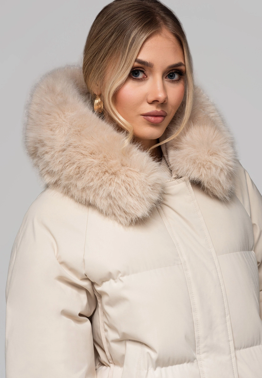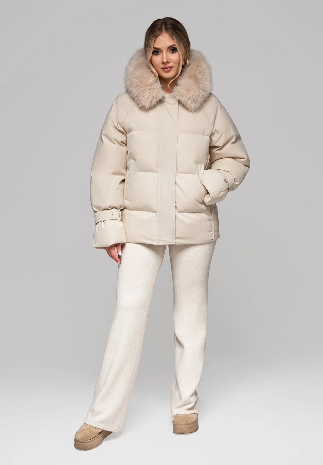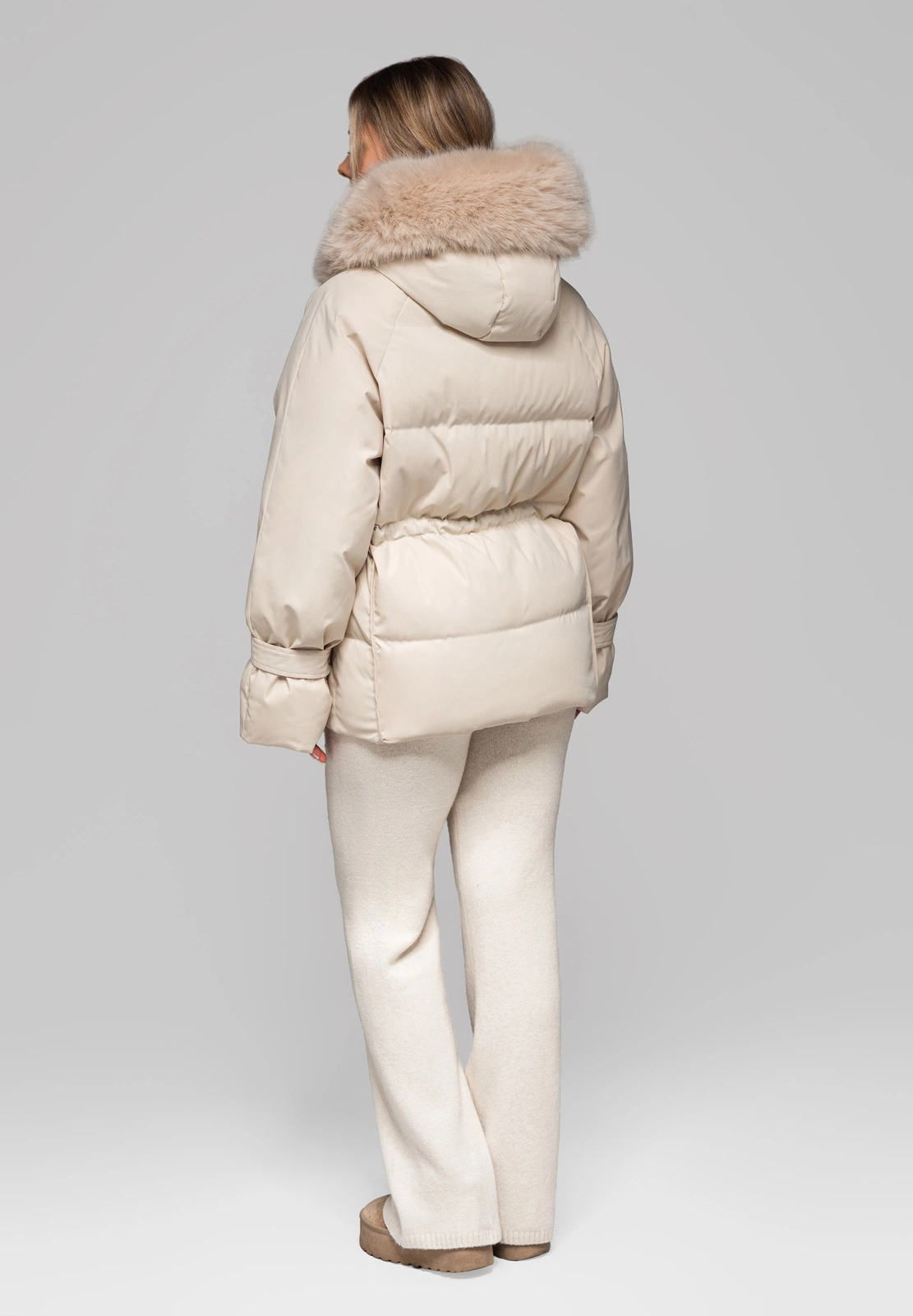 Funkcjonalna, krótka kurtka o luźniejszej linii, podkreślonej rękawem typu raglan (wszywanym skośnie od kołnierza). Model wyposażony jest w kaptur i ma dużą ilość sztucznego wypełnienia, zapewniającego wysoki komfort cieplny. Kurtka jest wykonana z gładkiej, matowej tkaniny poliestrowej. Zapinana jest na solidny zamek kostkowy, który jest dodatkowo kryty patką zapinaną na napy. Detale obejmują odpinane futerko przy kapturze, ozdobną wypustkę po bokach kurtki oraz dekoracyjne paski przy rękawach, zapinane na srebrne zatrzaski. Wewnątrz kurtki znajduje się regulowany ściągacz, poprawiający dopasowanie.