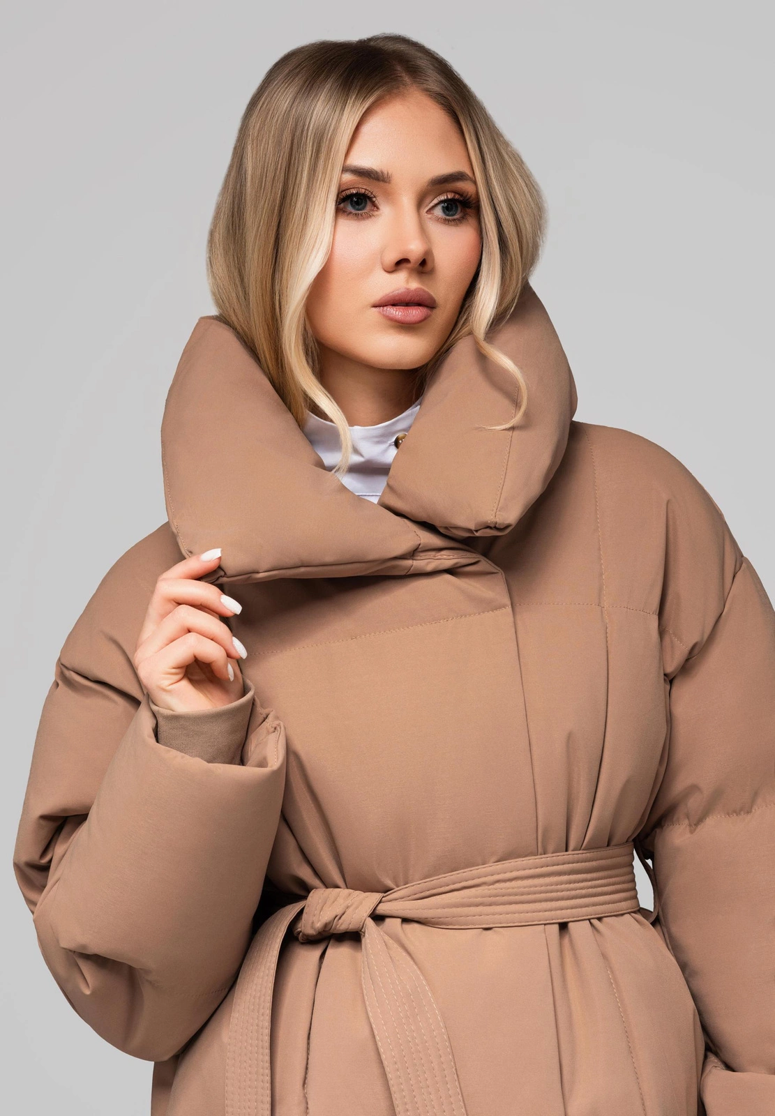 Kurtka damska pikowana z paskiem i stójką OW-JAHP-0106 v3 - brązowa