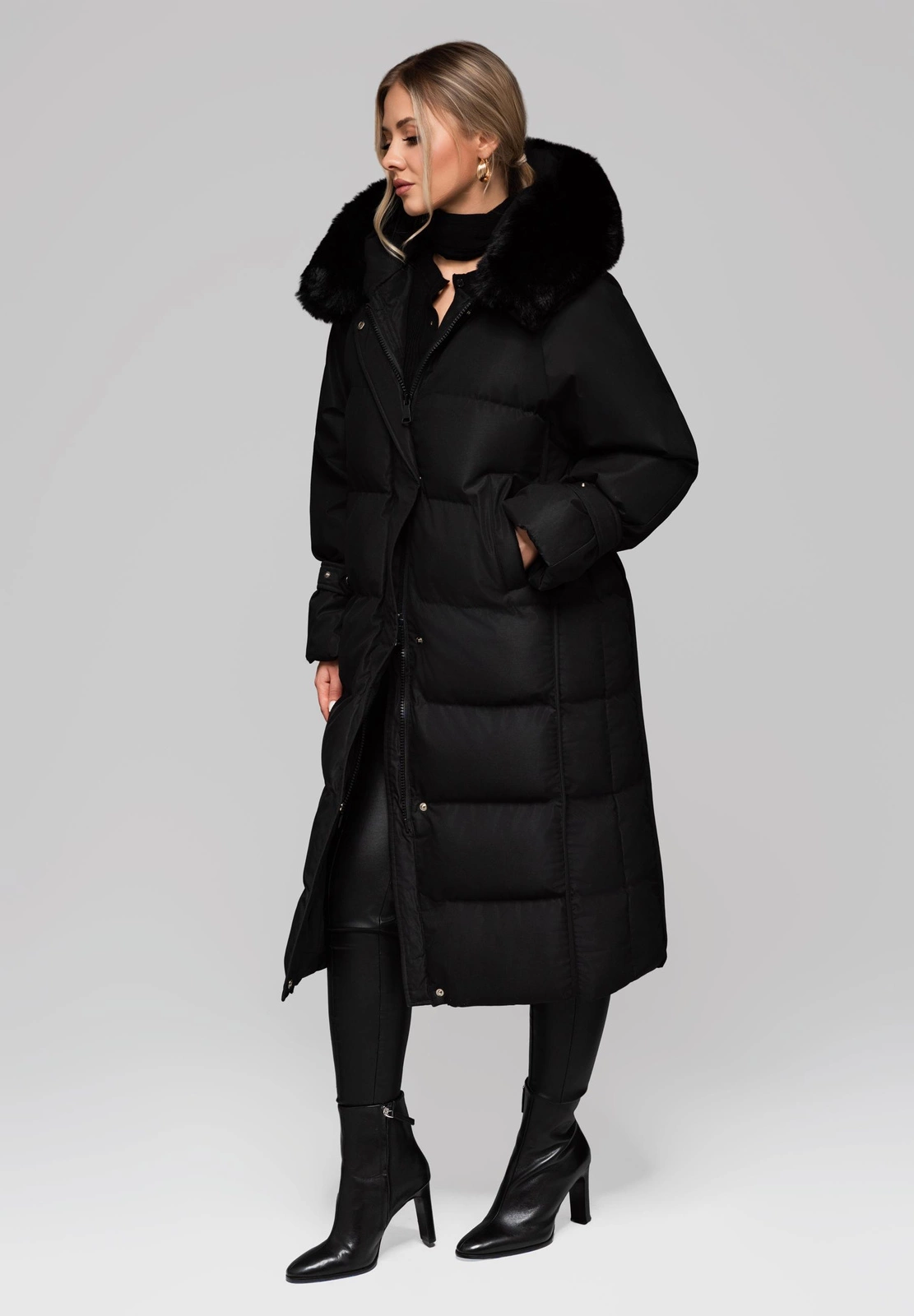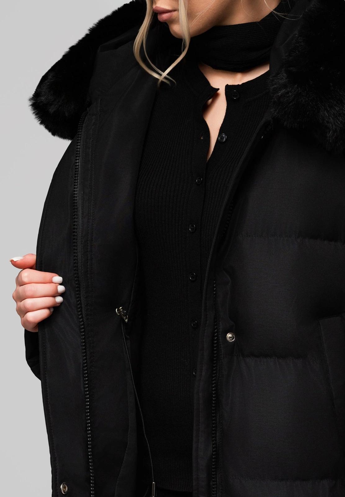 Funkcjonalna, długa kurtka z obszernym kapturem, idealna na chłodne dni. Charakteryzuje się luźniejszym krojem z rękawem typu raglan (wszywanym skośnie), który zapewnia swobodę ruchów. Model ma dużą ilość sztucznego wypełnienia, co gwarantuje wysoki komfort cieplny. Wykonana jest z gładkiej, matowej tkaniny poliestrowej. Kurtka zapinana jest na solidny zamek kostkowy, który jest dodatkowo kryty patką z napami. Detale obejmują odpinane futerko przy kapturze, ozdobną wypustkę po bokach oraz dekoracyjne paski przy rękawach, zapinane na srebrne zatrzaski. Wewnątrz kurtki znajduje się regulowany ściągacz, poprawiający dopasowanie.