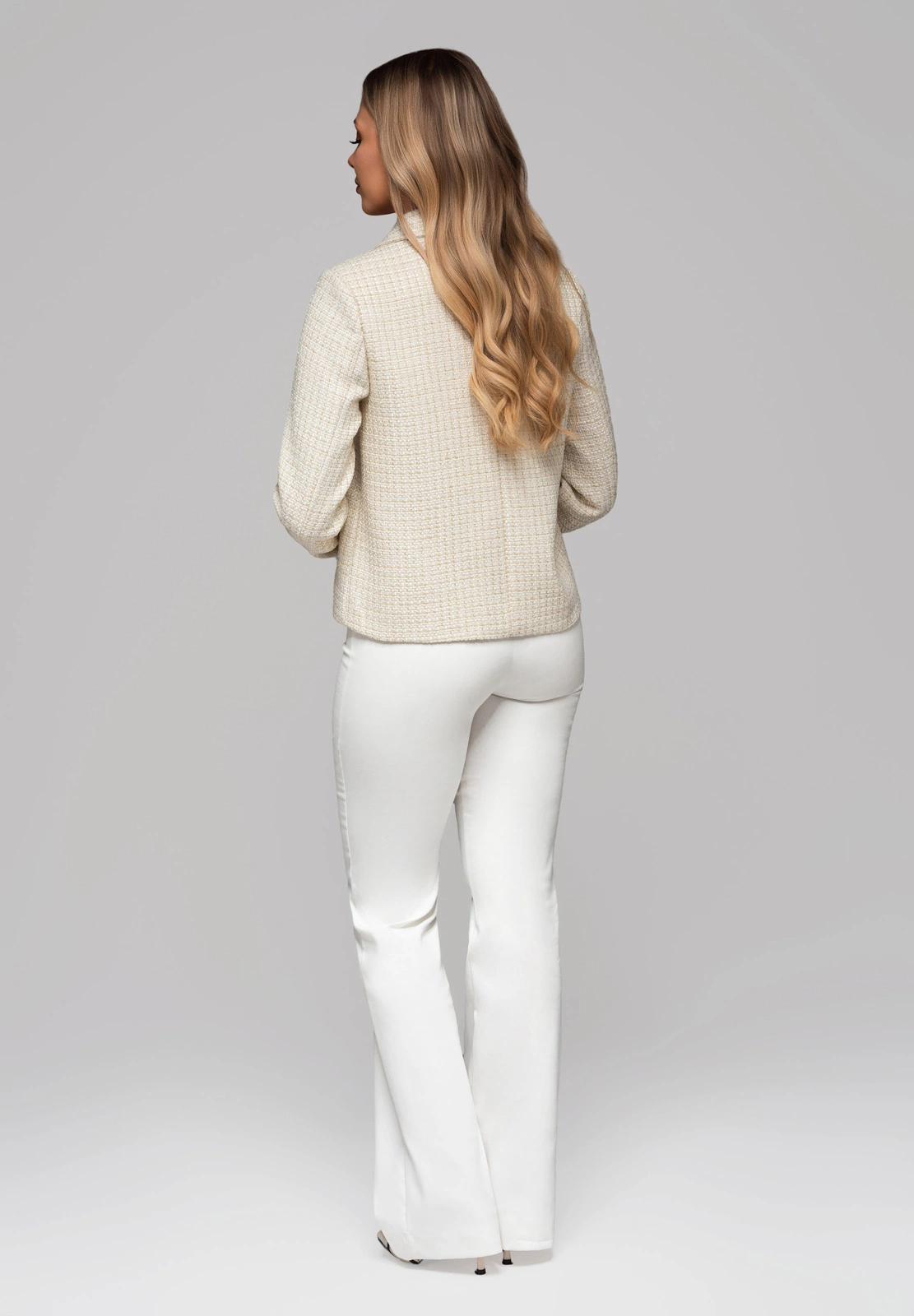 Elegancka marynarka o klasycznym kroju, wyposażona w tradycyjny, wykładany kołnierz. Zapinana jest na złote, ozdobne guziki, które stanowią główny element dekoracyjny. Materiał zewnętrzny to gładki 100% poliester, natomiast podszewka wykonana jest z tkaniny typu chanelka z błyszczącą nitką, co dodaje luksusowego akcentu. Marynarka posiada dwie funkcjonalne kieszenie z patkami, zapinane na złote guziki, oraz dodatkowe, estetyczne imitacje kieszeni z patkami na wysokości klatki piersiowej.