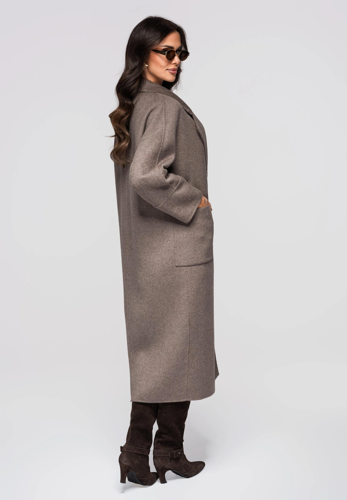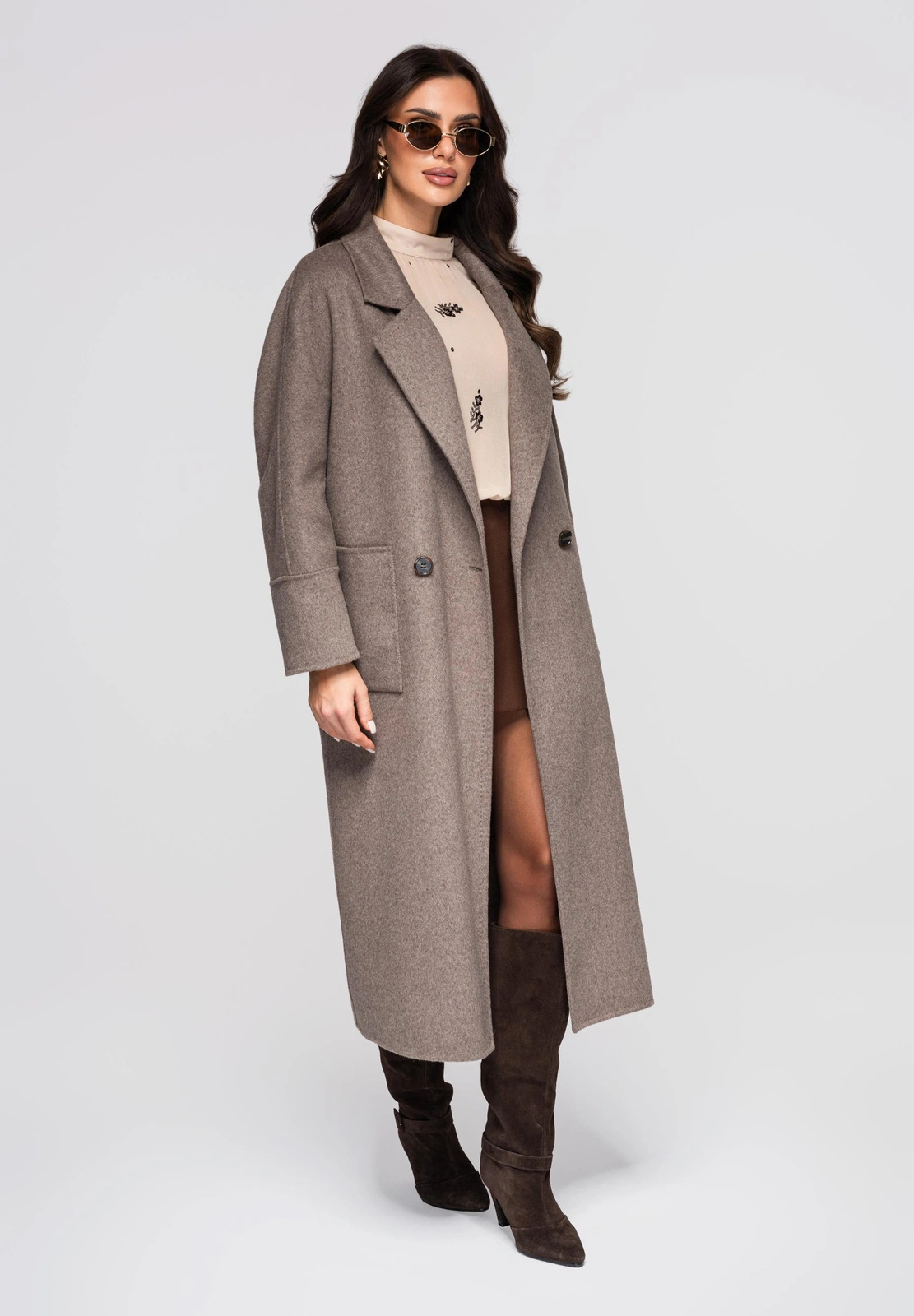 Długi płaszcz damski o kroju oversize, z szerokimi klapami kołnierza i klasycznymi rękawami, zapinany na guziki. Wykonany z tkaniny o delikatnym włosku, zapewniającej miękką i szlachetną strukturę. Model posiada dwie duże, naszywane kieszenie umiejscowione po bokach oraz rozcięcie z tyłu, ułatwiające swobodne poruszanie się.