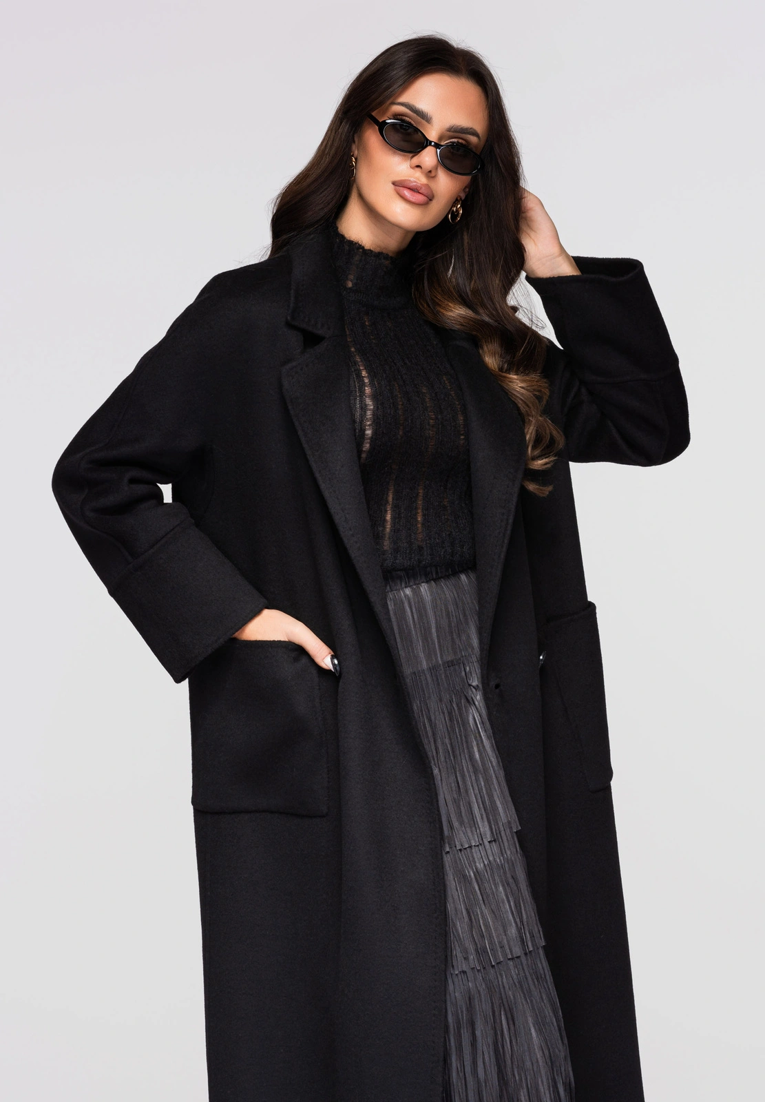 Długi płaszcz damski o kroju oversize, z szerokimi klapami kołnierza i klasycznymi rękawami, zapinany na guziki. Wykonany z tkaniny o delikatnym włosku, zapewniającej miękką i szlachetną strukturę. Model posiada dwie duże, naszywane kieszenie umiejscowione po bokach oraz rozcięcie z tyłu, ułatwiające swobodne poruszanie się.