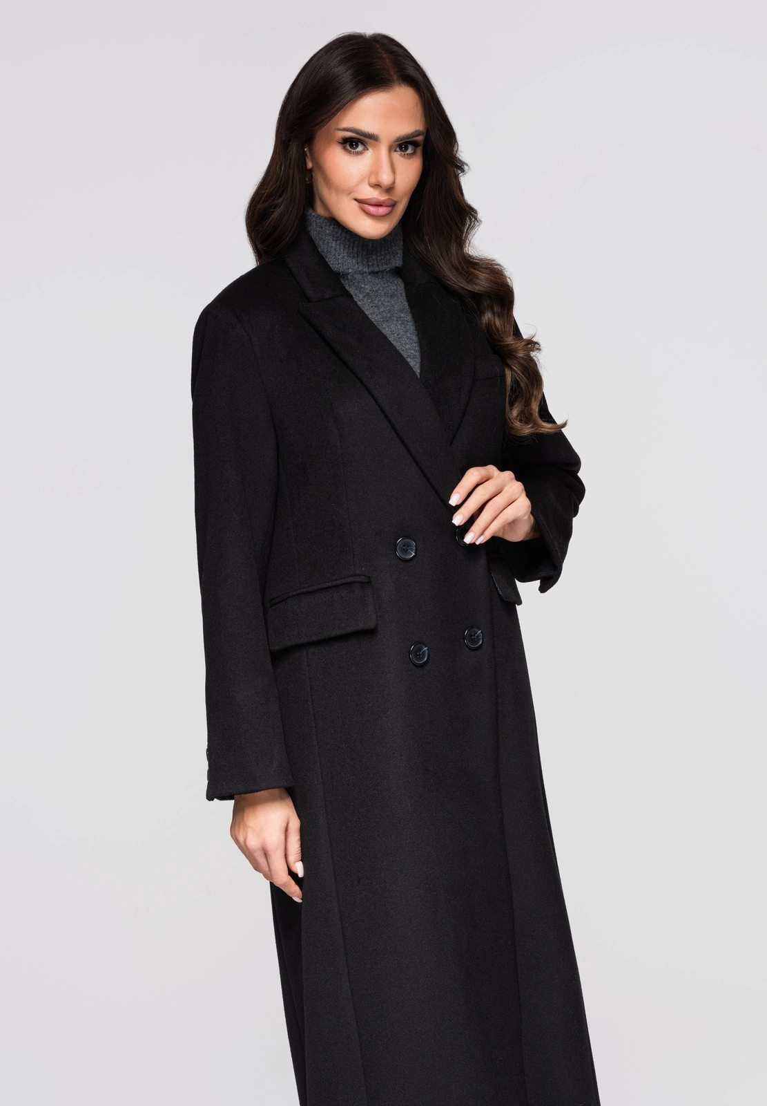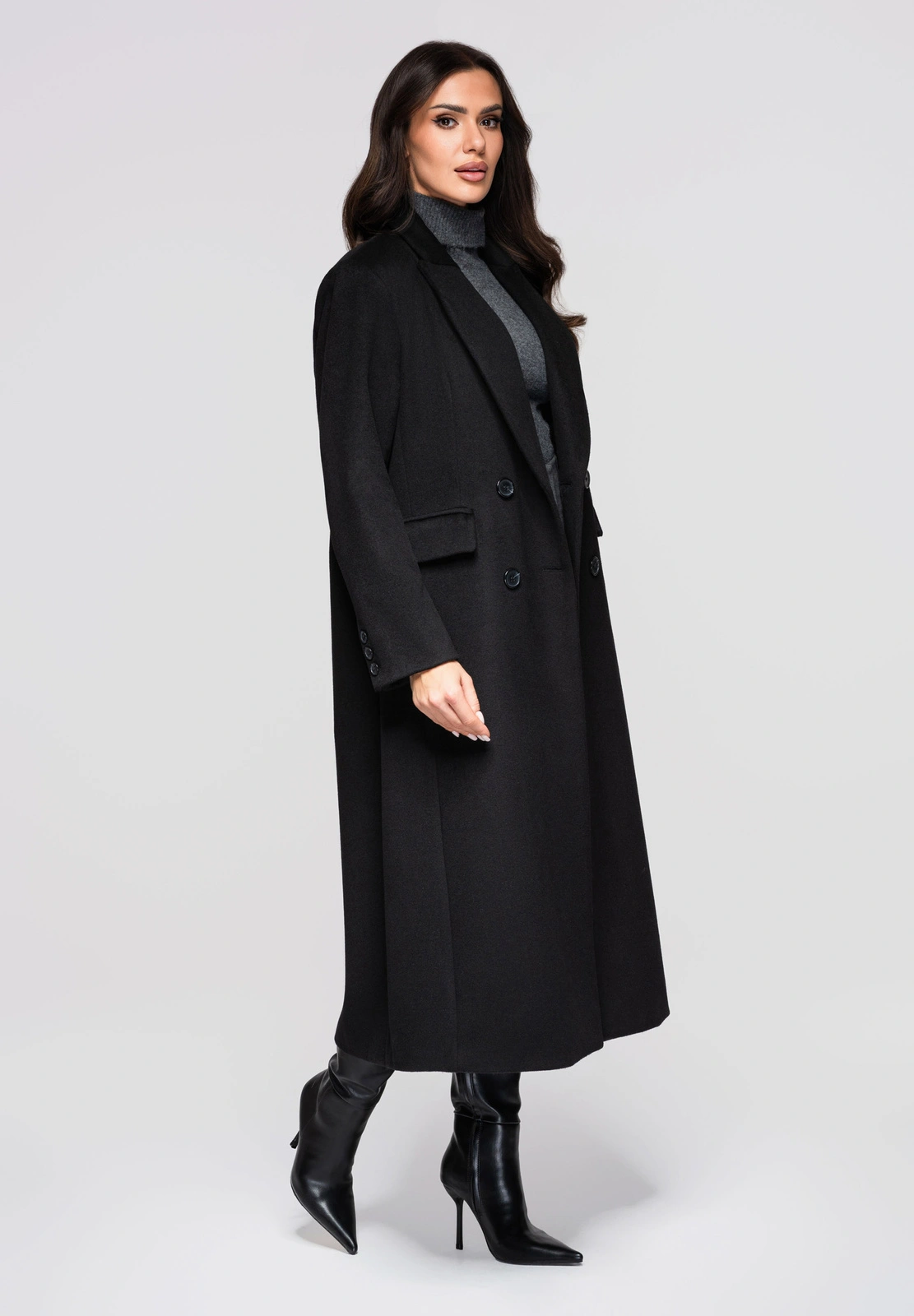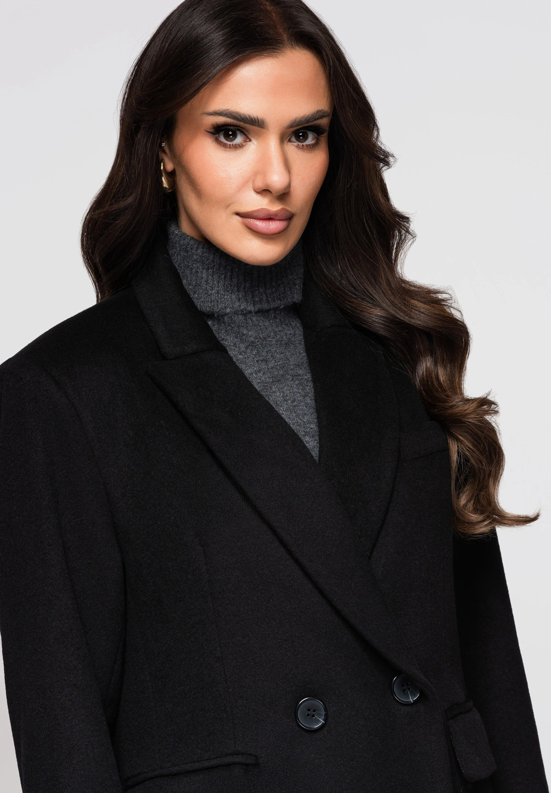Komfortowy, długi płaszcz o modnym, oversizowym kroju, który gwarantuje swobodę ruchów. Jest to model dwurzędowy, zapinany na guziki. Materiał zewnętrzny to ciepła mieszanka z dominującą wełną (52,4%), poliestrem, wiskozą, akrylem i poliamidem, posiadająca delikatny włosek. Płaszcz posiada klasyczny kołnierz rewersowy (marynarkowy) i wykończony jest od wewnątrz podszewką z poliestru i wiskozy. Konstrukcja zawiera rozporek z tyłu dla lepszego komfortu chodzenia oraz dwie praktyczne kieszenie z klapami. Charakterystyczne detale to ozdobne, szylkretowe guziki przy mankietach oraz imitacja kieszeni umieszczona na klatce piersiowej